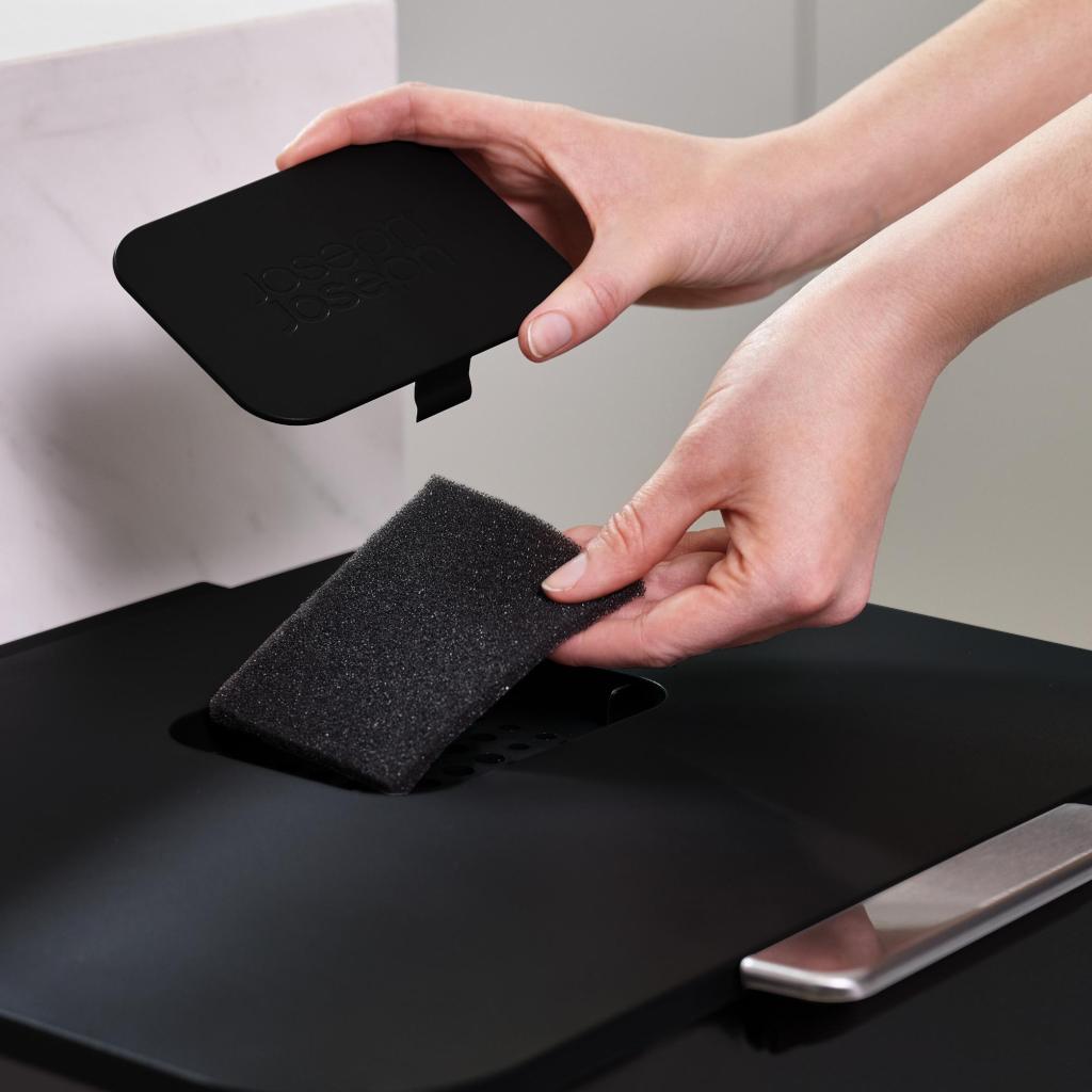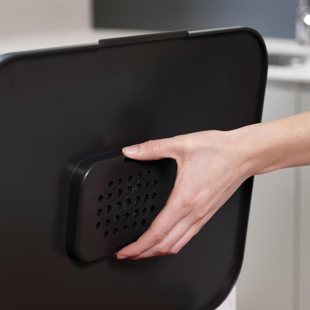 - Der medfølger også en aftagelig beholder til bioaffald på 3 liter, som nemt kan bæres til bordpladen under madlavning.