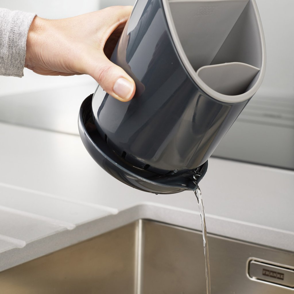 Ejere af opvaskemaskiner vil også nyde godt af den sammenklappelige drypbakke Dock. Kvalitetsknive og køkkenredskaber af træ skal vaskes op i hånden. Det lille designstativ kan nemt finde en plads på ethvert skrivebord. Beholderens indre rum er opdelt i fire sektioner. Den smalle slids bruges til at lægge knivene væk - klingen er således perfekt beskyttet mod stød fra andre værktøjer. Det ophobede vand kan nemt hældes ud af bundskålen med tuden.