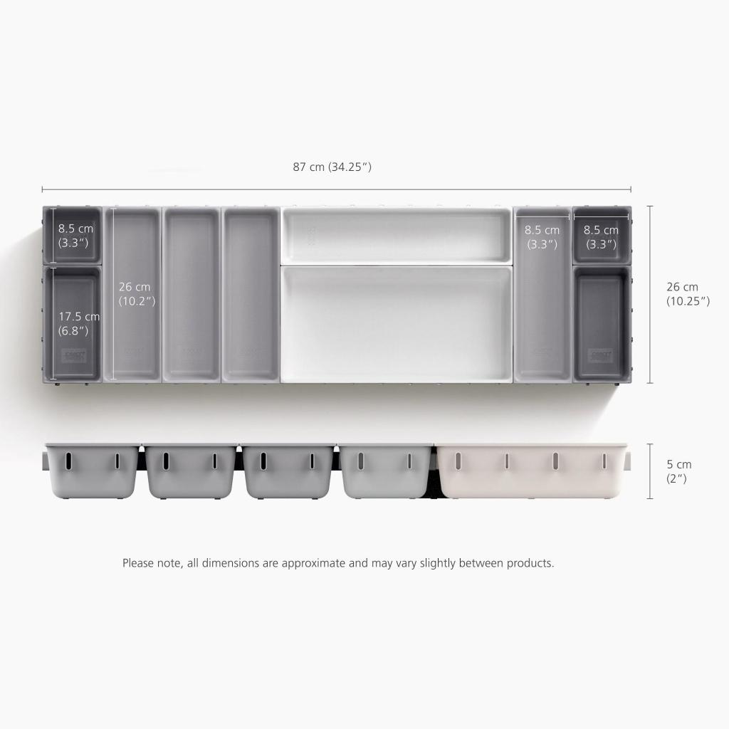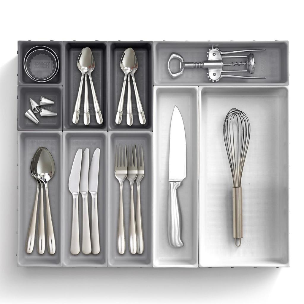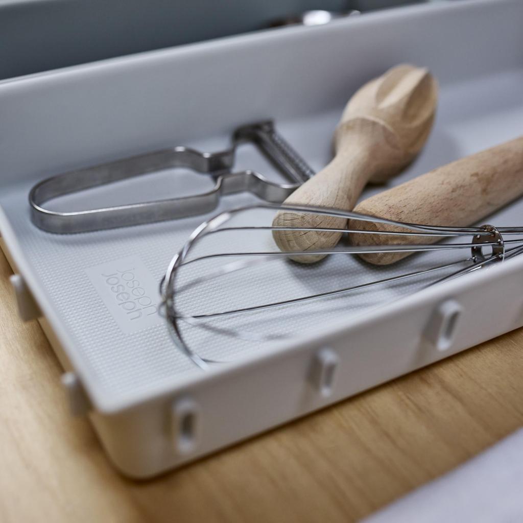- Joseph Joseph BLOX skuffeorganizer tilbyder et praktisk modulært system, der hjælper med at organisere bestik, køkkenredskaber, kontorartikler eller små værktøjer overskueligt.
