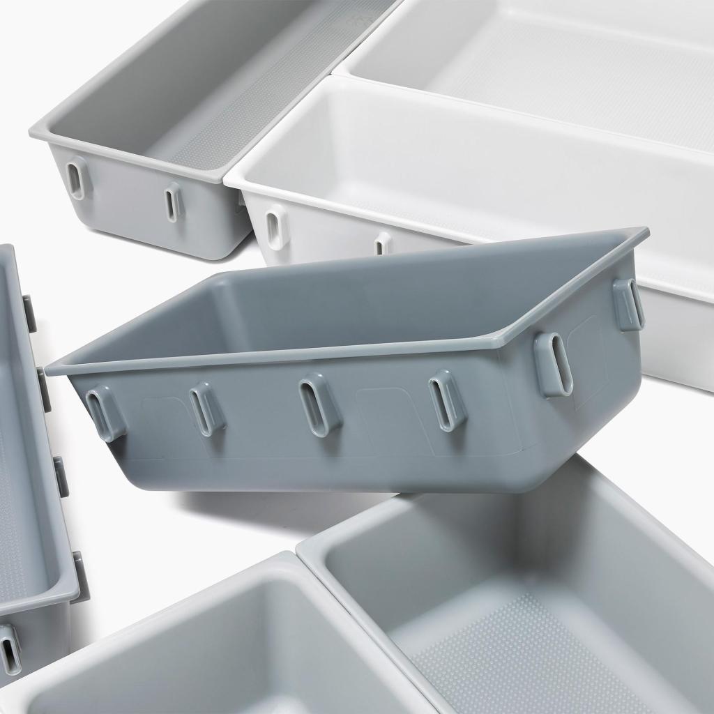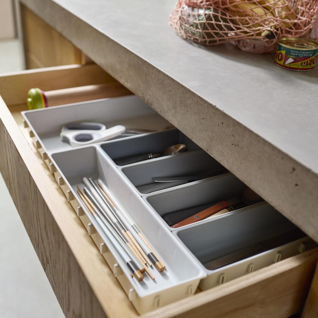 - Den modulære konstruktion gør det muligt at kombinere de enkelte dele efter behov og tilpasse organizeren til forskellige typer skuffer i køkkenet, på kontoret eller i værkstedet.