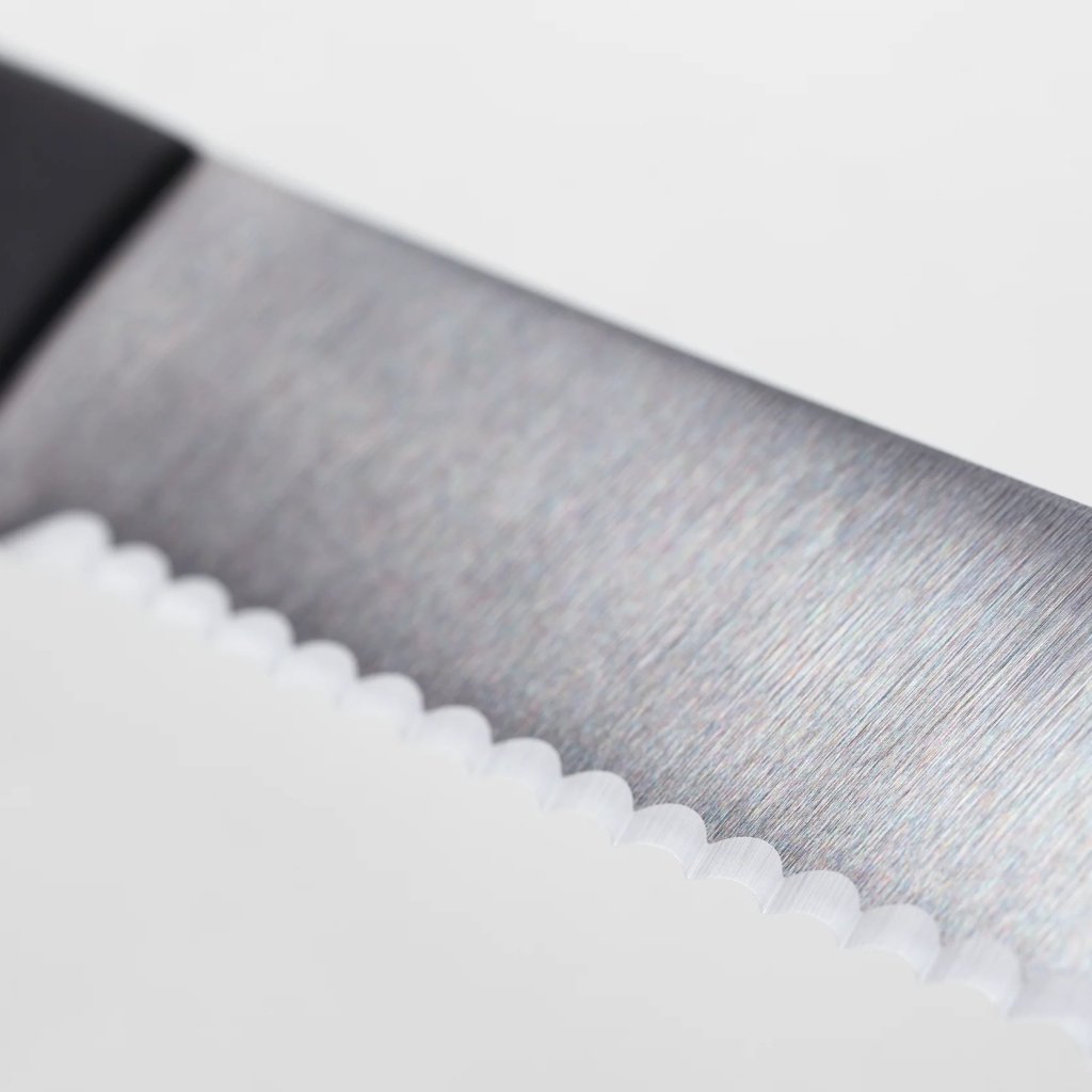 - det savtakkede blad giver et rent snit uden behov for stærkt tryk, hvilket gør det behageligt og sikkert at skære, selv for mindre erfarne kokke