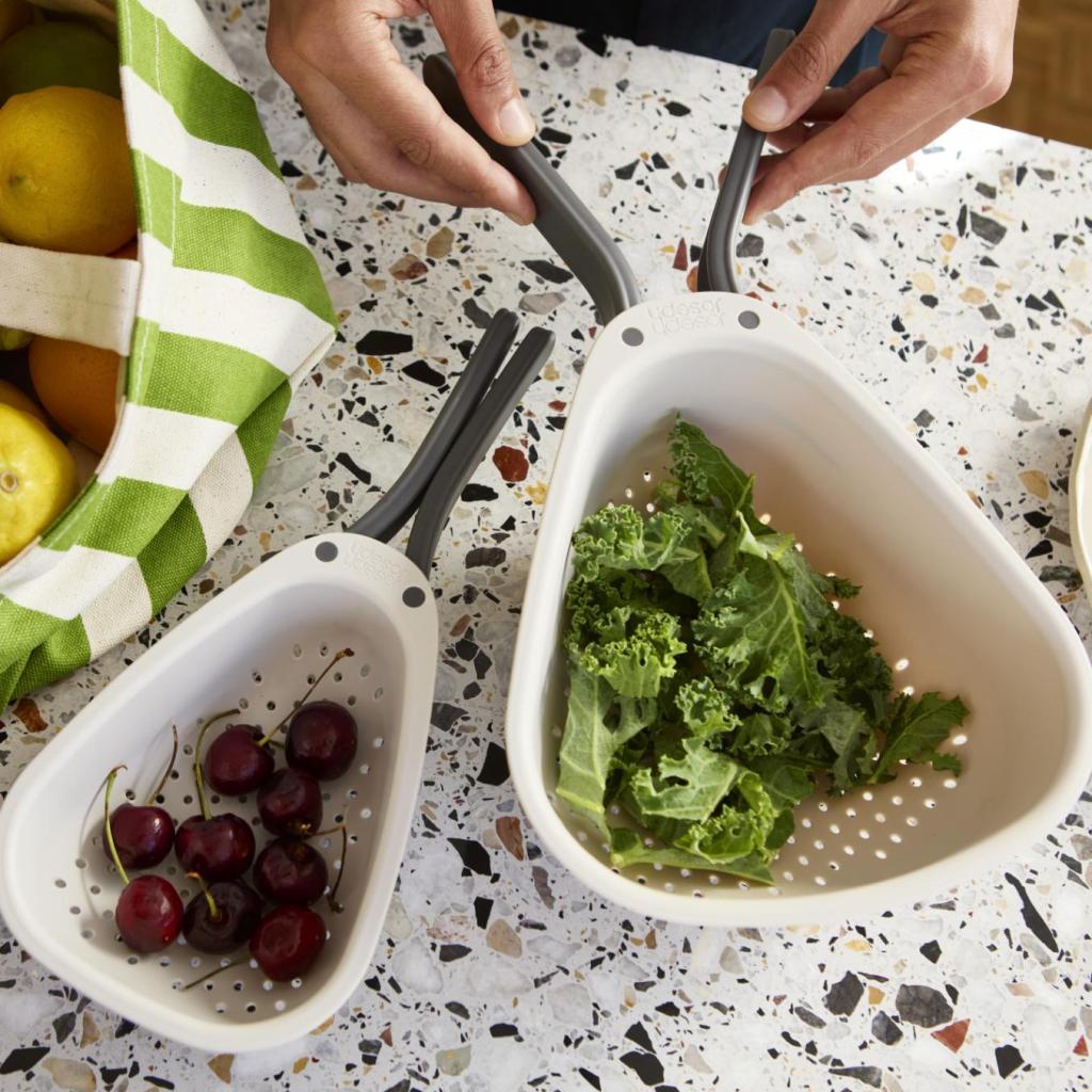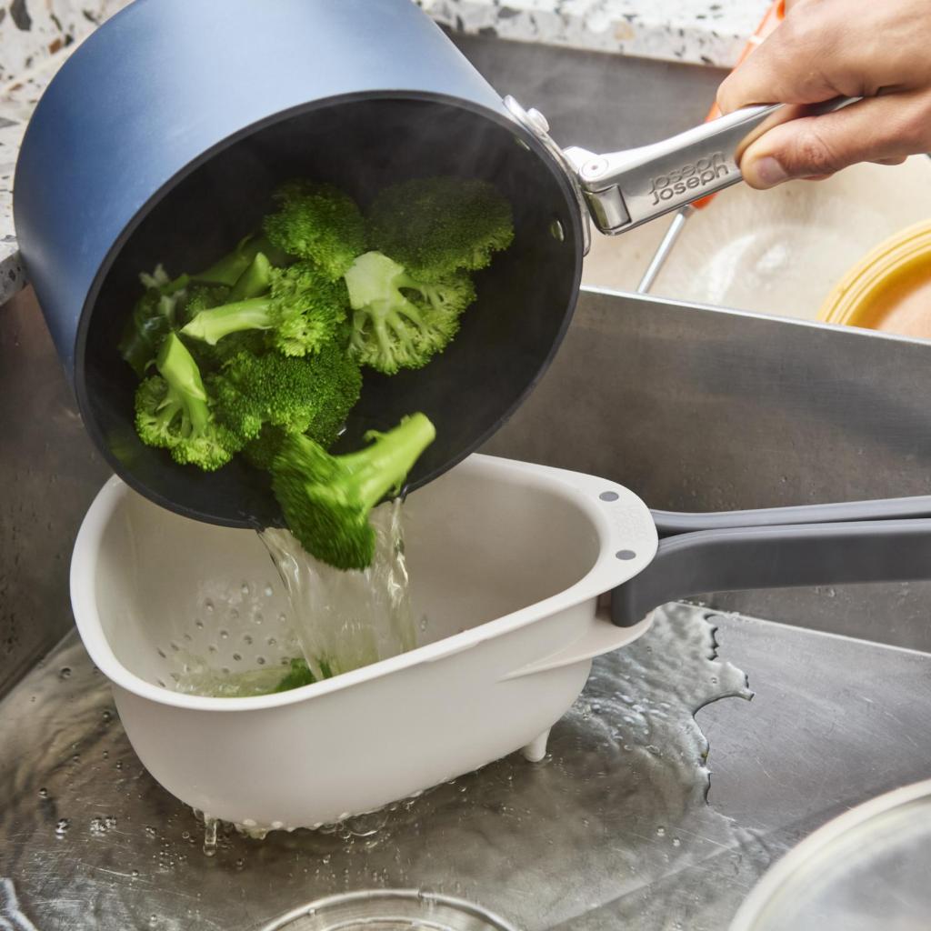 - Stort Joseph Joseph DROPLET dørslag med praktisk foldbart håndtag er en ideel hjælper til bekvem skylning af grøntsager, dræning af pasta og hurtig hældning af vand direkte i vasken.