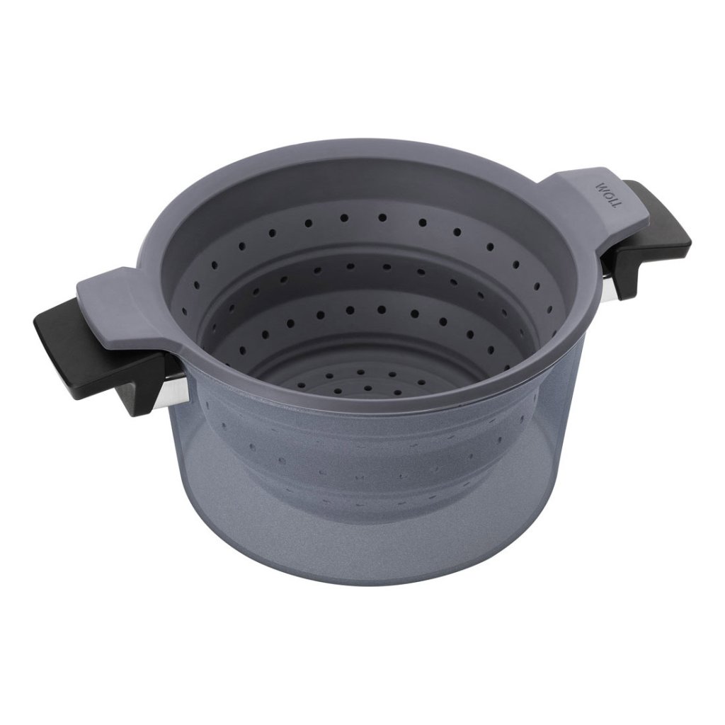 Når den er foldet sammen, bliver den til en stænkskærm til gryden under madlavningen eller en grydemåtte, der beskytter arbejdsfladen eller bordet mod kogegrejets strålevarme. Med denne silikoneindsats kan din gryde forvandles til en dampkoger eller pastagryde på få sekunder.
