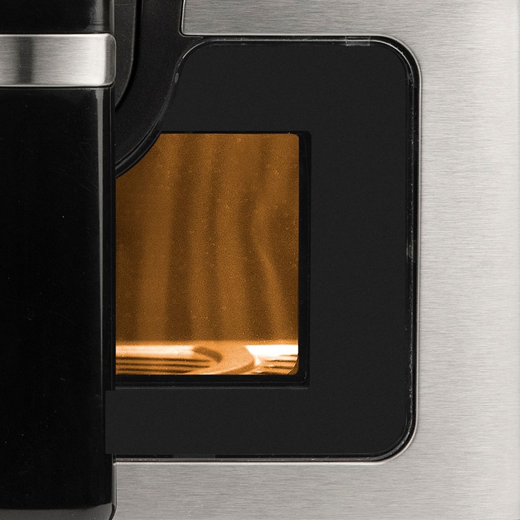 - designet kombinerer en sort, mat krop med detaljer i rustfrit stål og et gennemsigtigt vindue til kontrol af bagningen