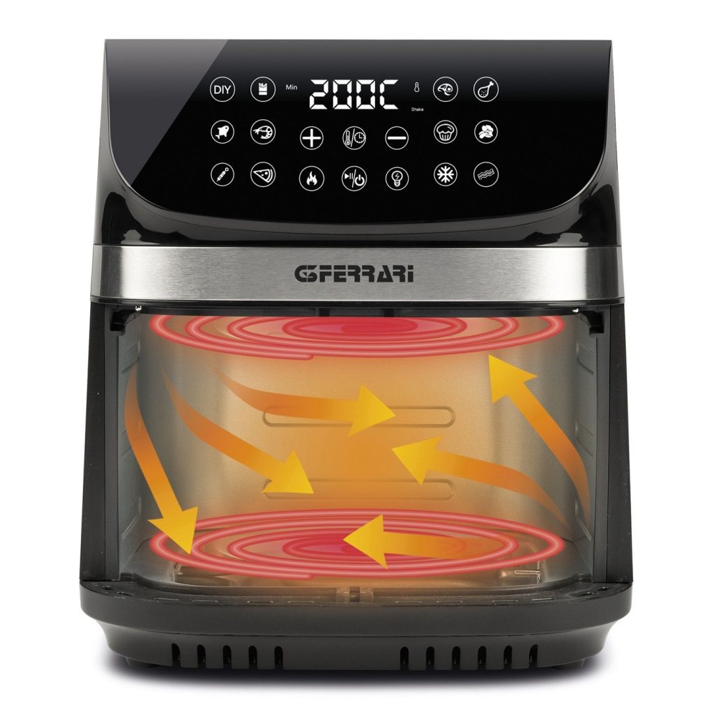- kraftig blæser og varmluftscirkulation fremmer hurtig tilberedning uden behov for olie