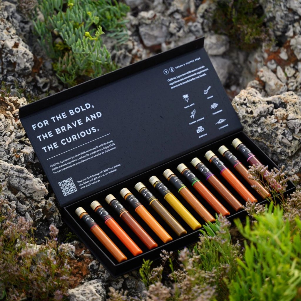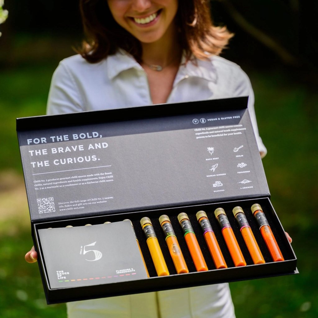 - Elegant sort emballage med hvid skrift og logo Chilli No5 giver hele sættet et luksuriøst og stilfuldt look, der passer til enhver lejlighed.