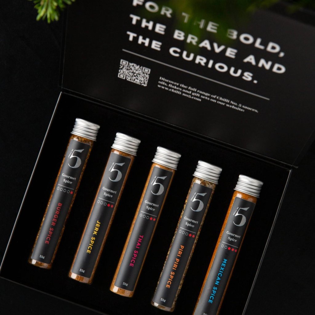- Gavesæt SPICES, RUBS & SEASONING fra Chilli No5 indeholder fem typer krydderiblandinger med en vægt på 35 g, der giver dine retter en intens smag og aroma inspireret af køkkener fra hele verden.