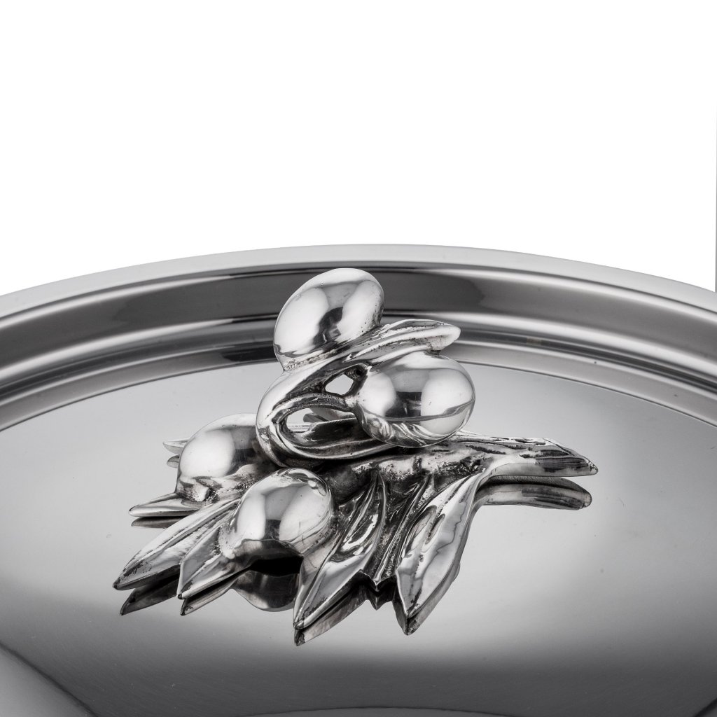 - solidt låg i rustfrit stål med et håndtag i en smuk dekoration, som er håndstøbt i massiv bronze og forsølvet