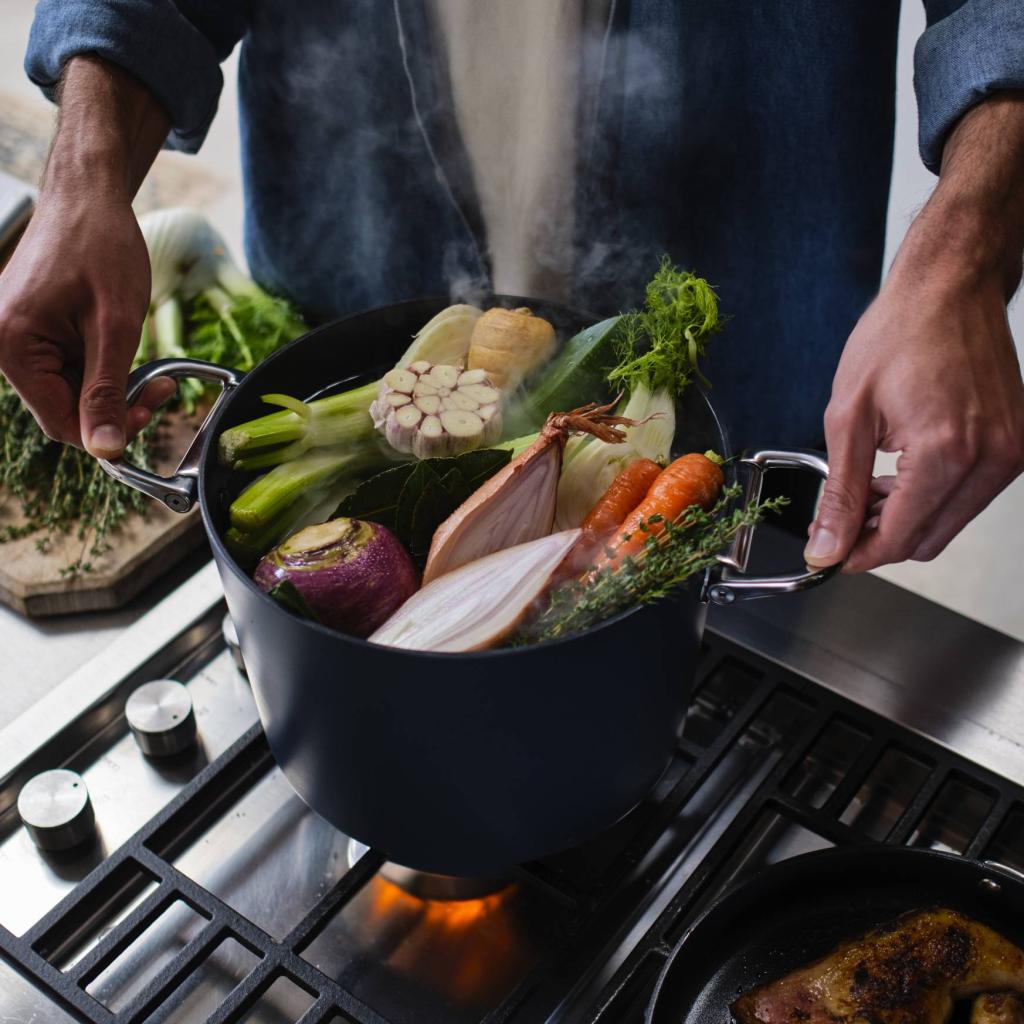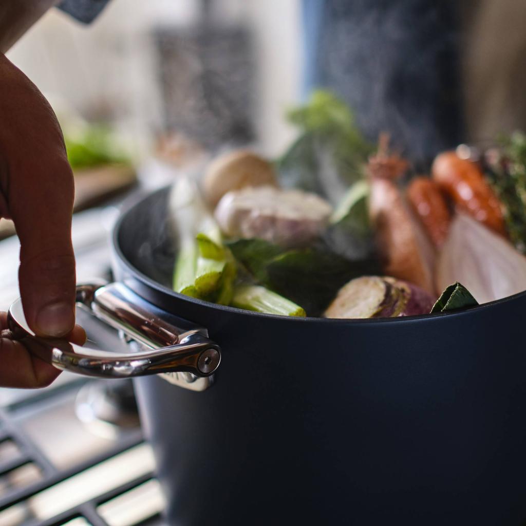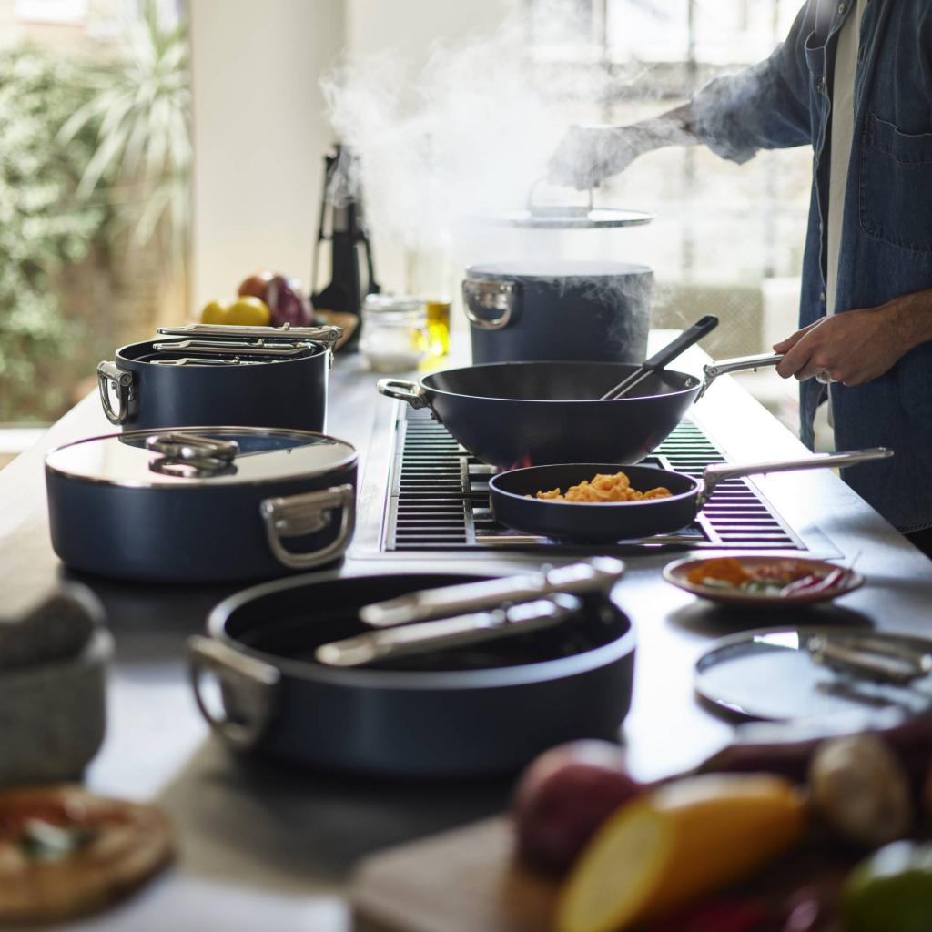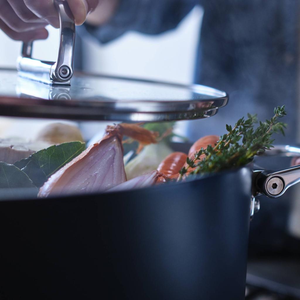 - Ved at folde håndtagene sammen sparer du betydelig plads, hvilket du især vil sætte pris på i mindre køkkener eller når du opbevarer flere tallerkener oven på hinanden.