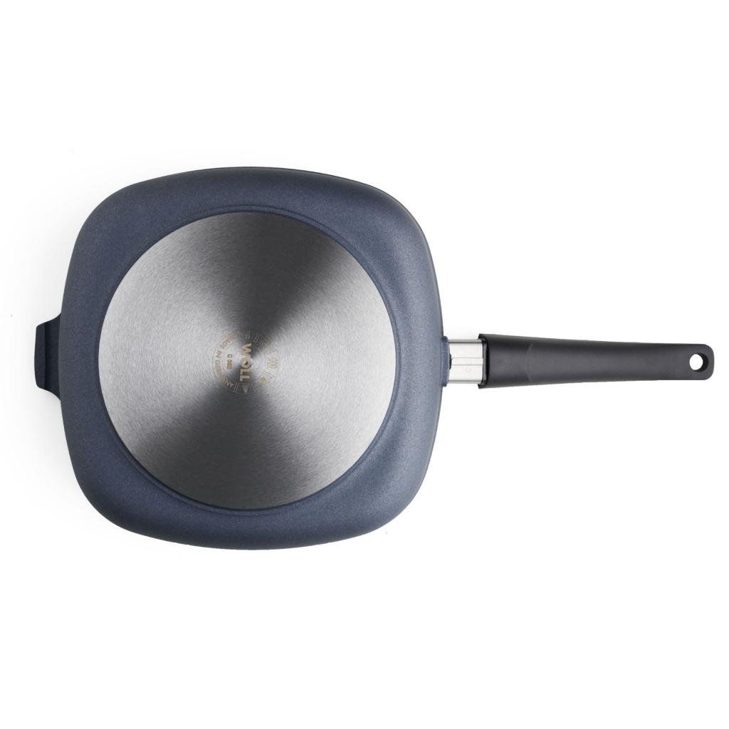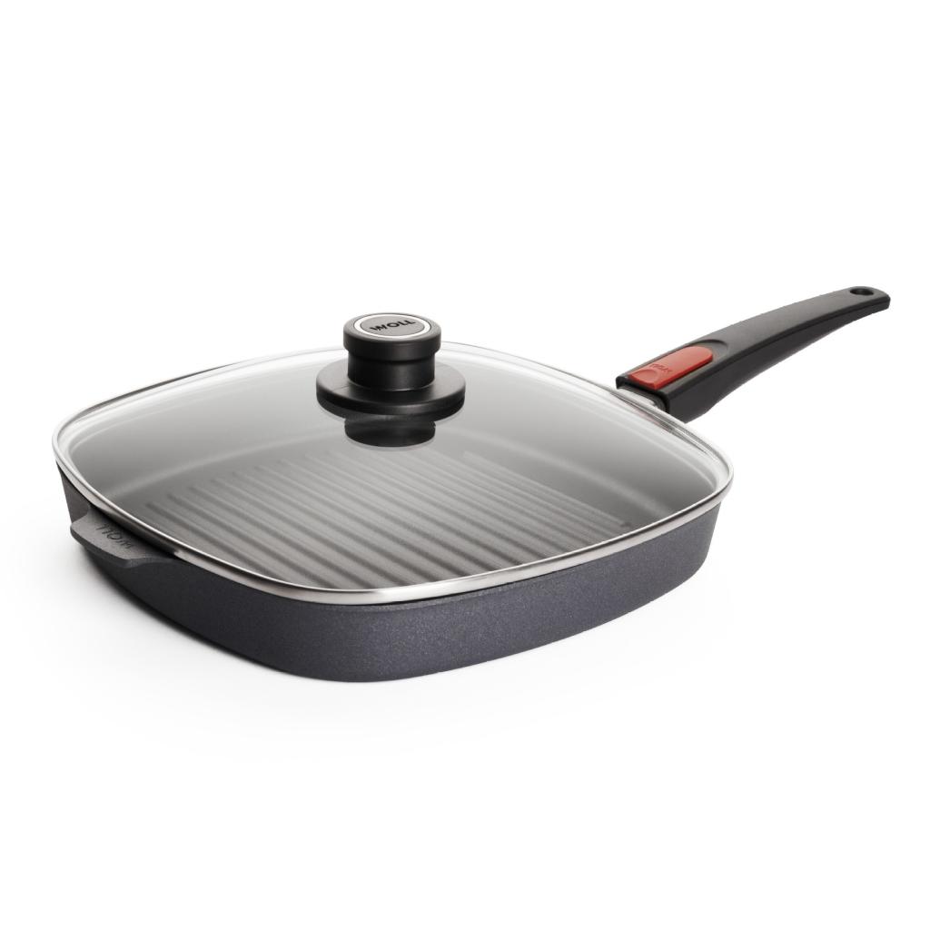 - Den indeholder en klassisk firkantet pande og en firkantet grillpande pande med glaslåg, begge måler 28 × 28 cm og med et aftageligt håndtag for maksimal fleksibilitet.