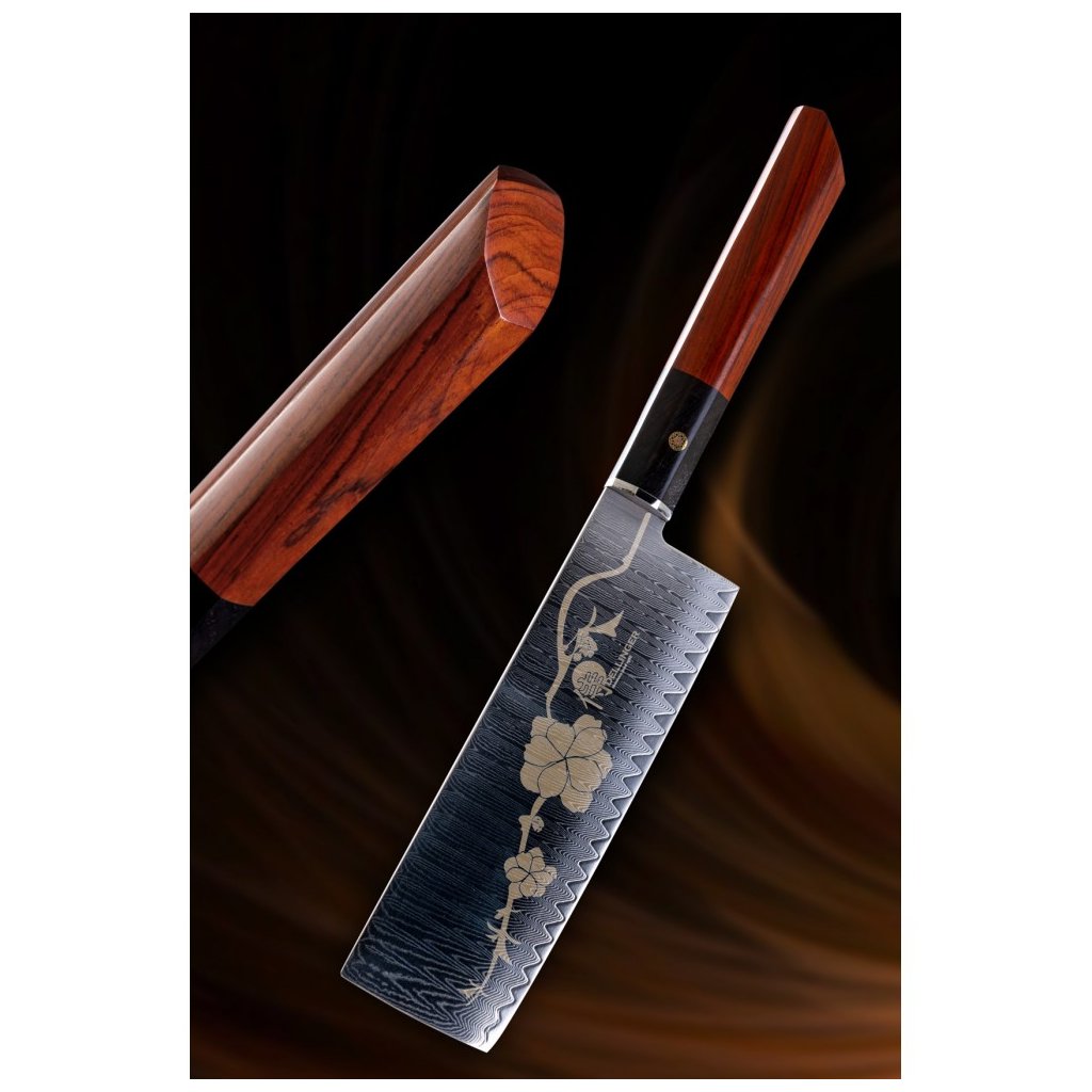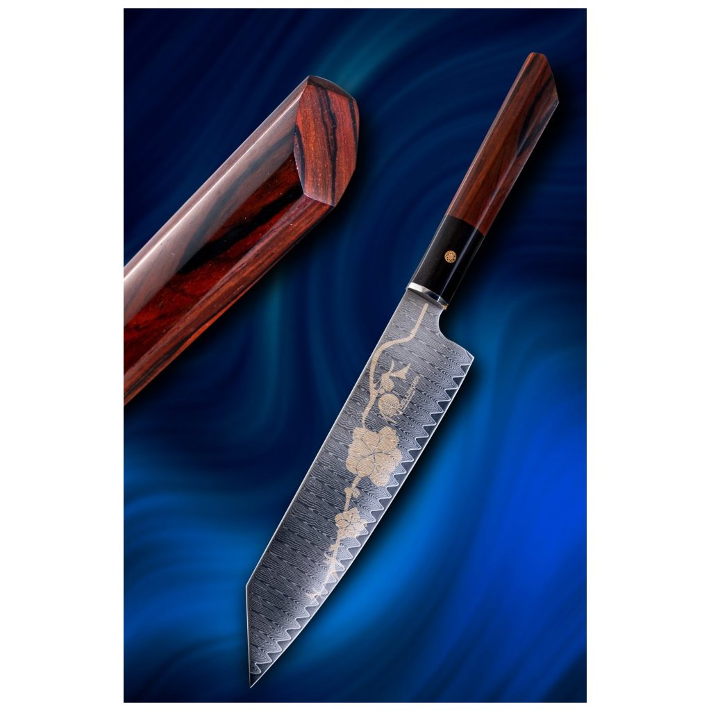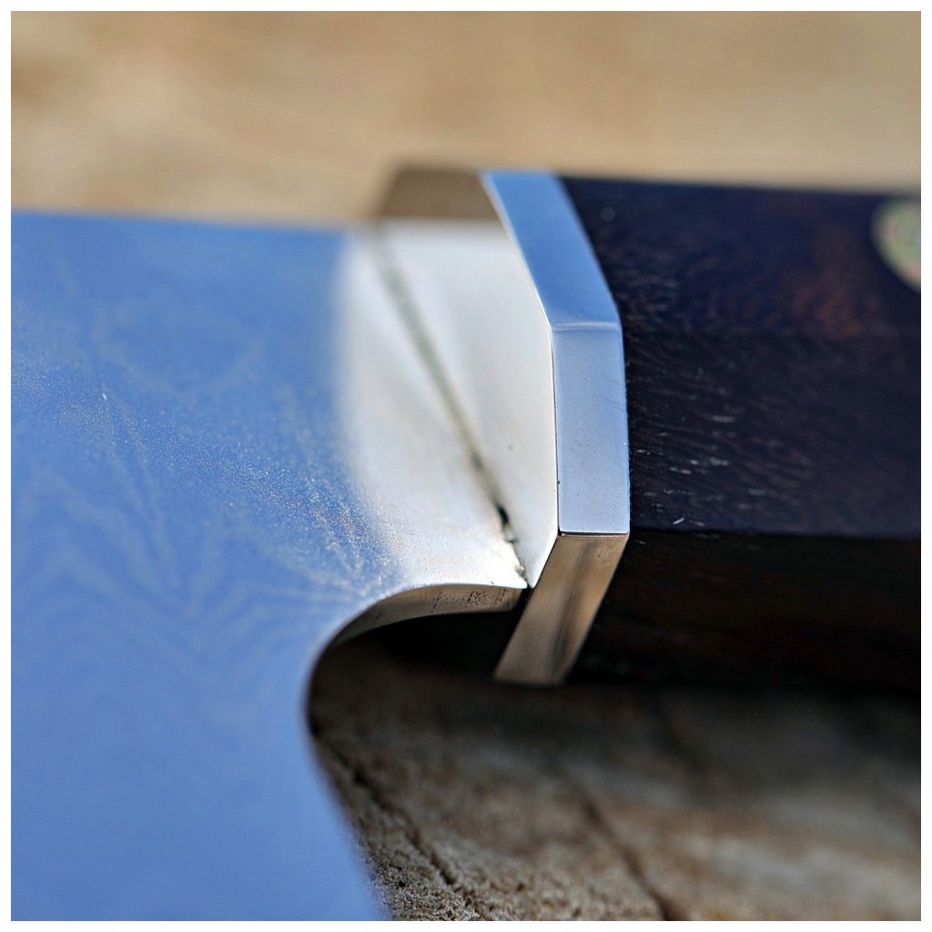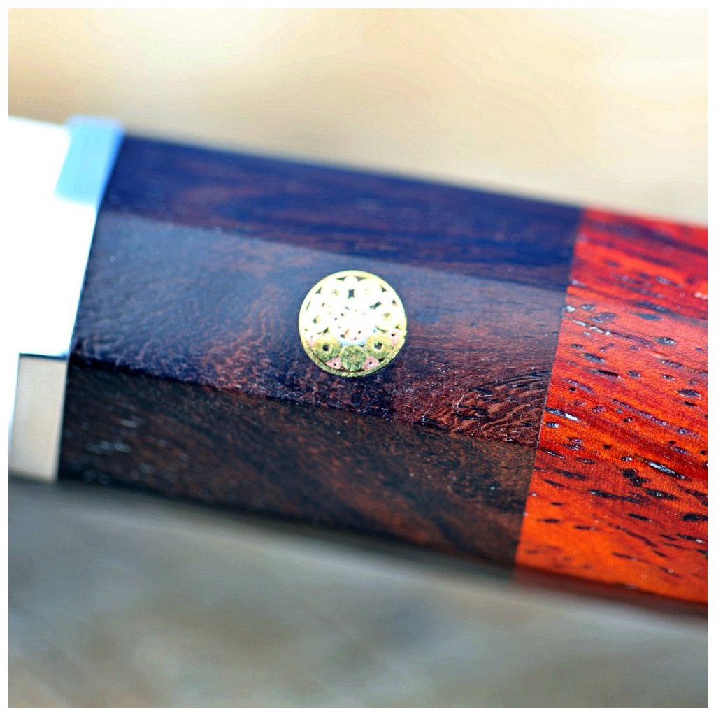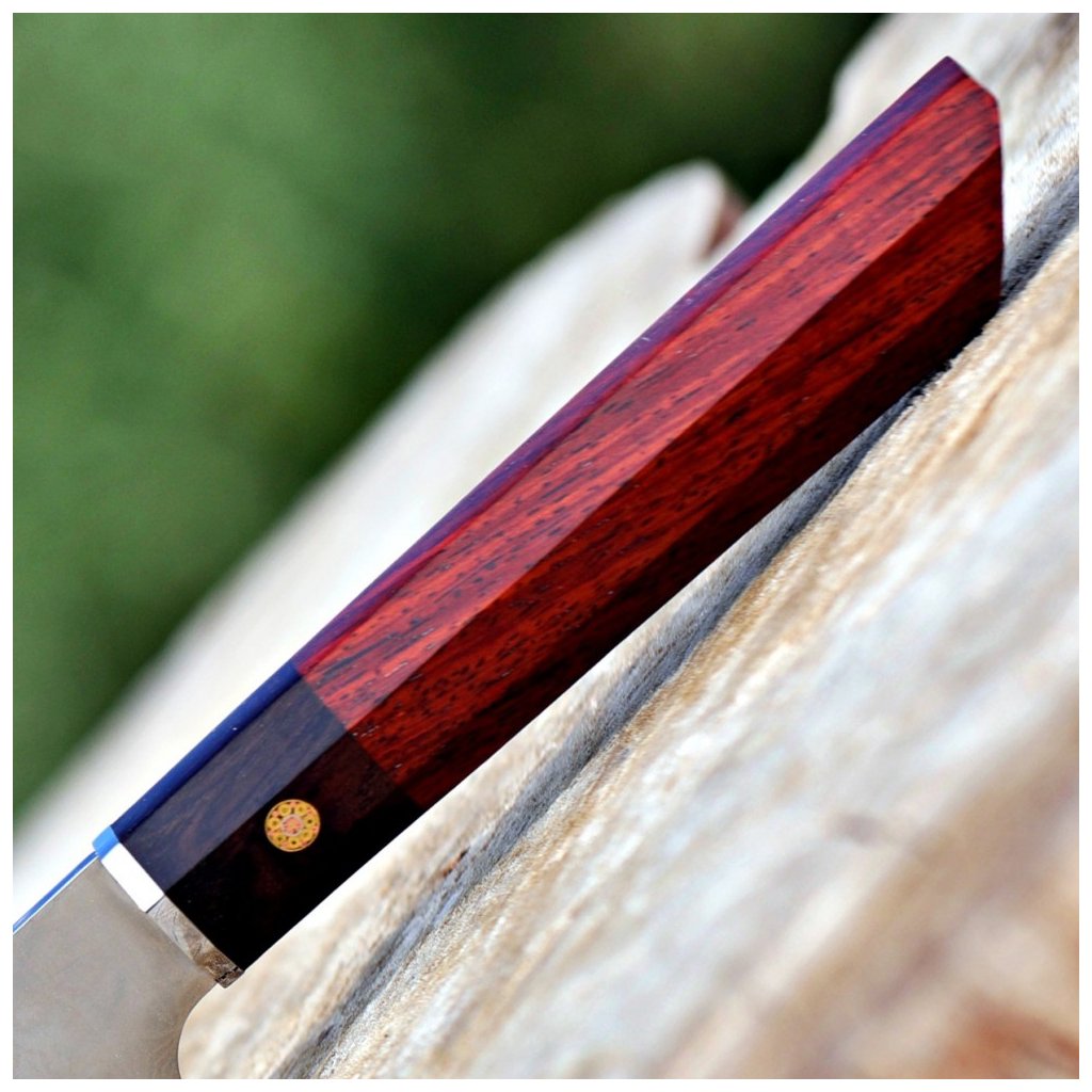 Det ottekantede håndtag er lavet af stabiliseret rosentræ og ibenholt. Den er dekoreret med en central mosaiknitte og er altid omhyggeligt håndpoleret og ergonomisk formet. Ideelt designet til fremragende håndkontrol. Skærmens specialdesignede form er velegnet til asiatiske knivgreb.