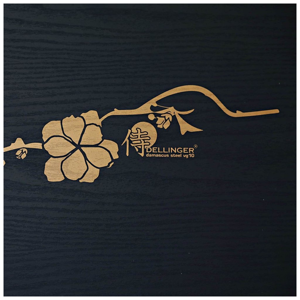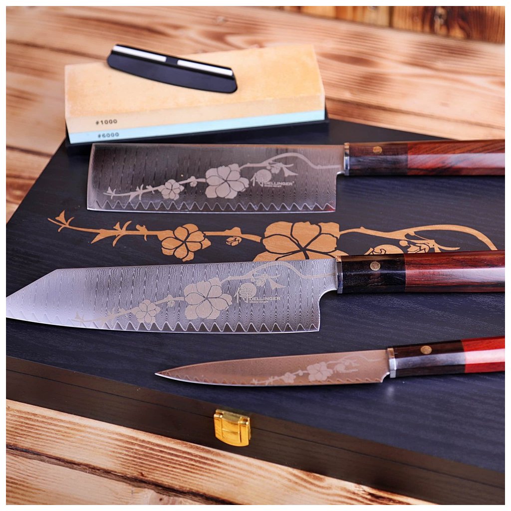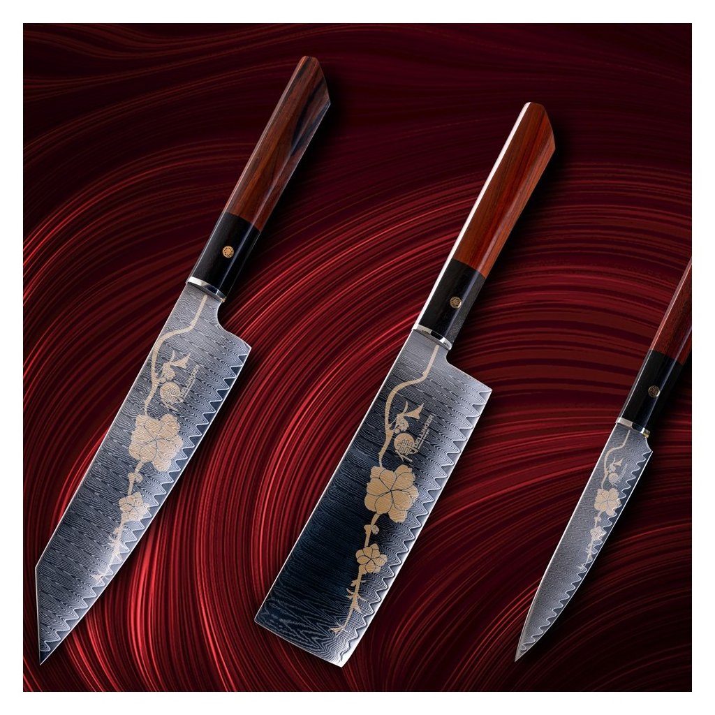 Smukt sæt med 3 knive Dellinger JOSHI Sakura lavet af japansk damaskusstål VG-10 med imponerende tegning af sakura på bladet. Den meget skarpe og hårde skærekerne af japansk vg-10-stål er meget godt beskyttet mod korrosion ved at være klemt inde mellem 66 lag af 2 SS316 rustfrit stål (damaskusstål), som sikrer enestående holdbarhed og sejhed.
