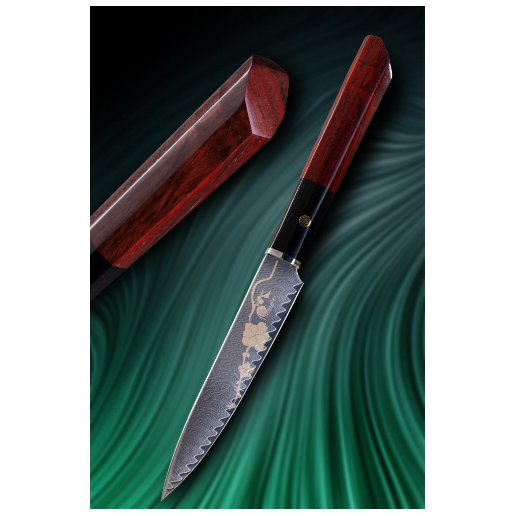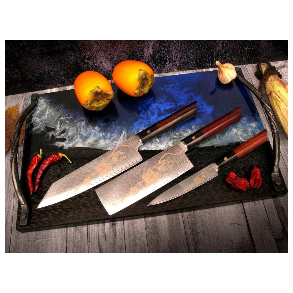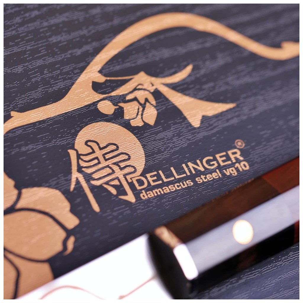 Smukt sæt med 3 knive Dellinger JOSHI Sakura lavet af japansk damaskusstål VG-10 med imponerende tegning af sakura på bladet. Den meget skarpe og hårde skærekerne af japansk vg-10-stål er meget godt beskyttet mod korrosion ved at være klemt inde mellem 66 lag af 2 SS316 rustfrit stål (damaskusstål), som sikrer enestående holdbarhed og sejhed.