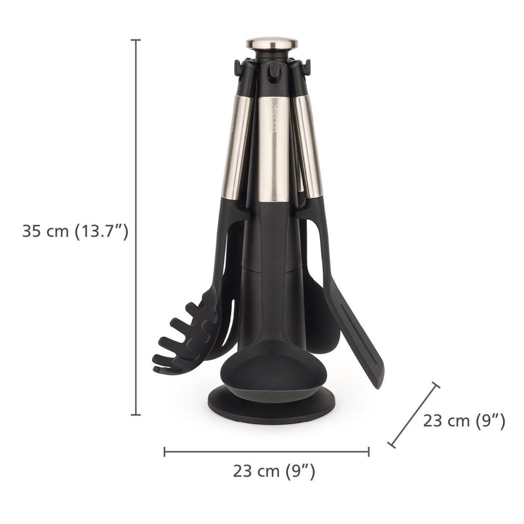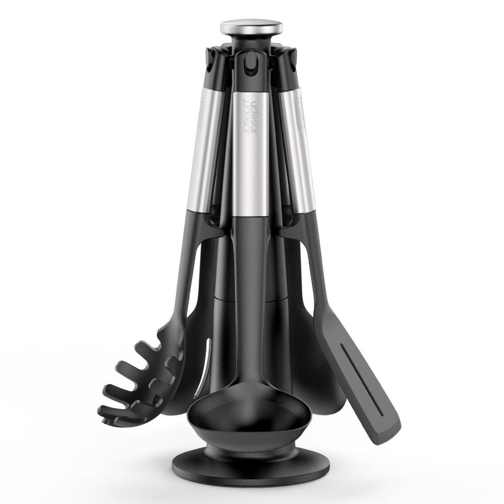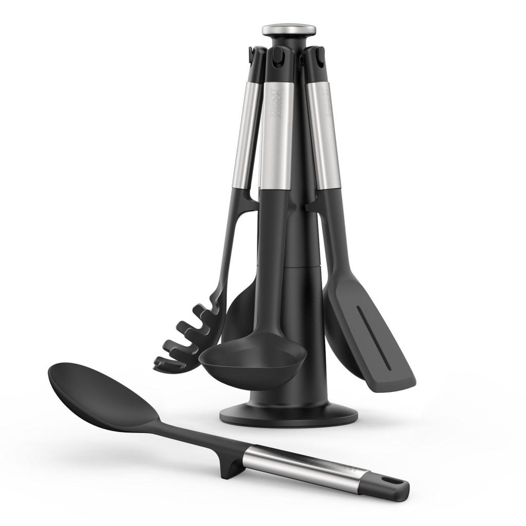 - Joseph Joseph ELEVATE køkkenredskabssættet er en praktisk løsning til daglig madlavning, da det tilbyder fem essentielle redskaber opbevaret i et roterende stativ for nem adgang.