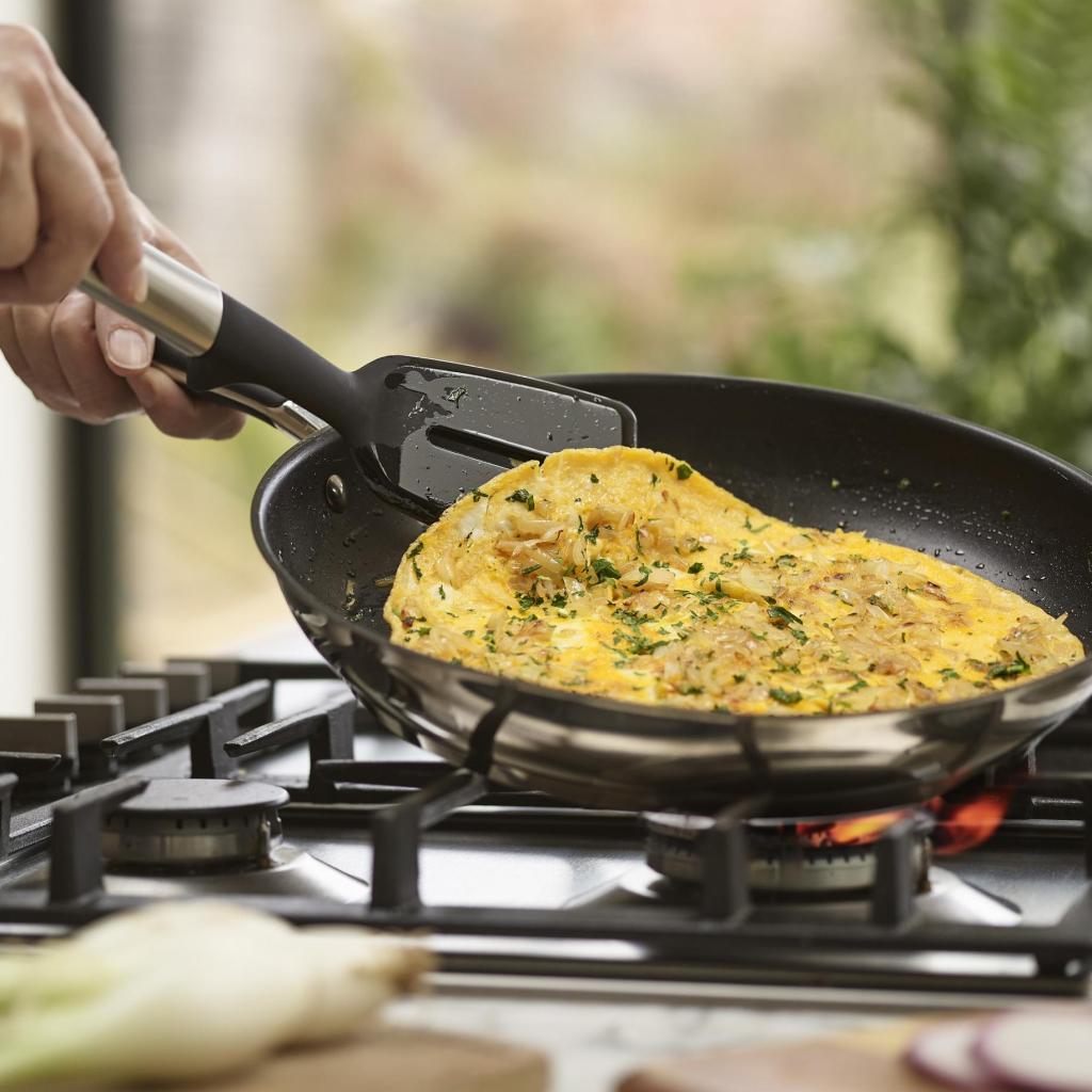 - Integrerede støtter og afbalancerede håndtag forhindrer, at redskabets arbejdsdel rører ved arbejdsfladen under madlavningen.