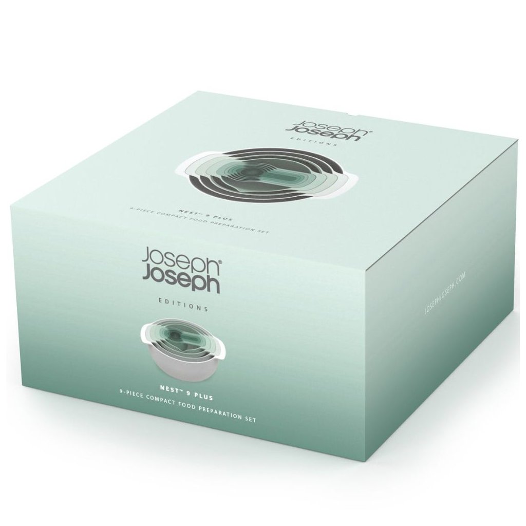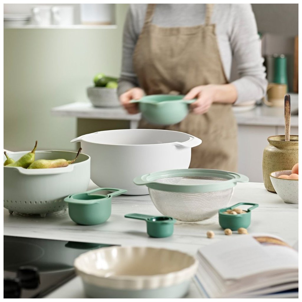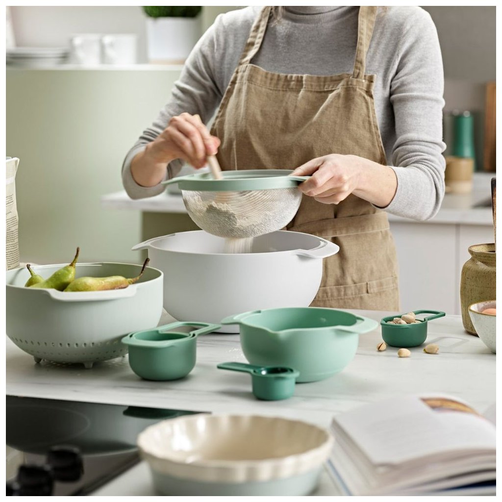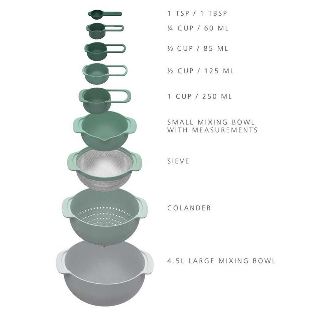 Køkkenskålsæt NEST 40112, sæt med 9 stk, med dørslag og målebægre, grå/grøn, Joseph Joseph