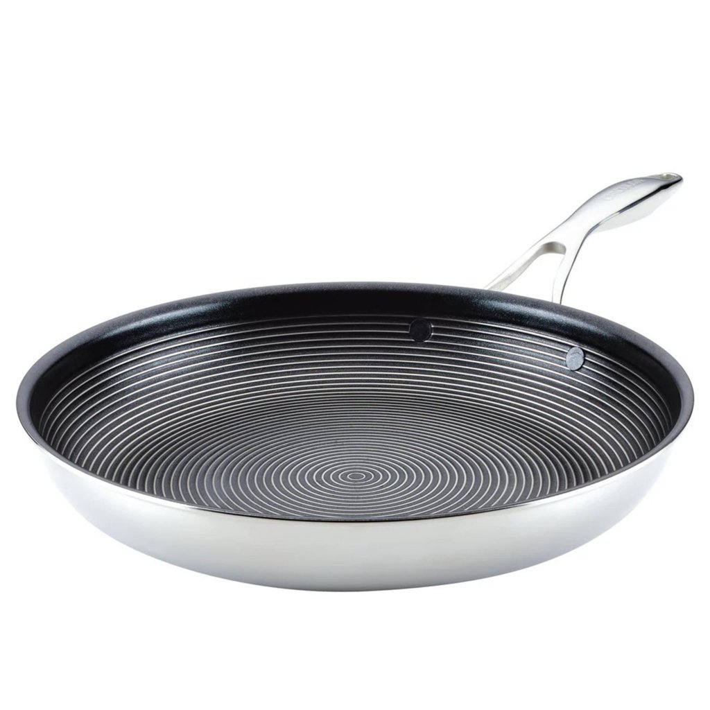 - hybrid non-stick-overflade med hævede elementer i rustfrit stål beskytter non-stick-rillerne, så du ikke behøver at bekymre dig om at ridse eller skrælle belægningen, når du bruger metalredskaber