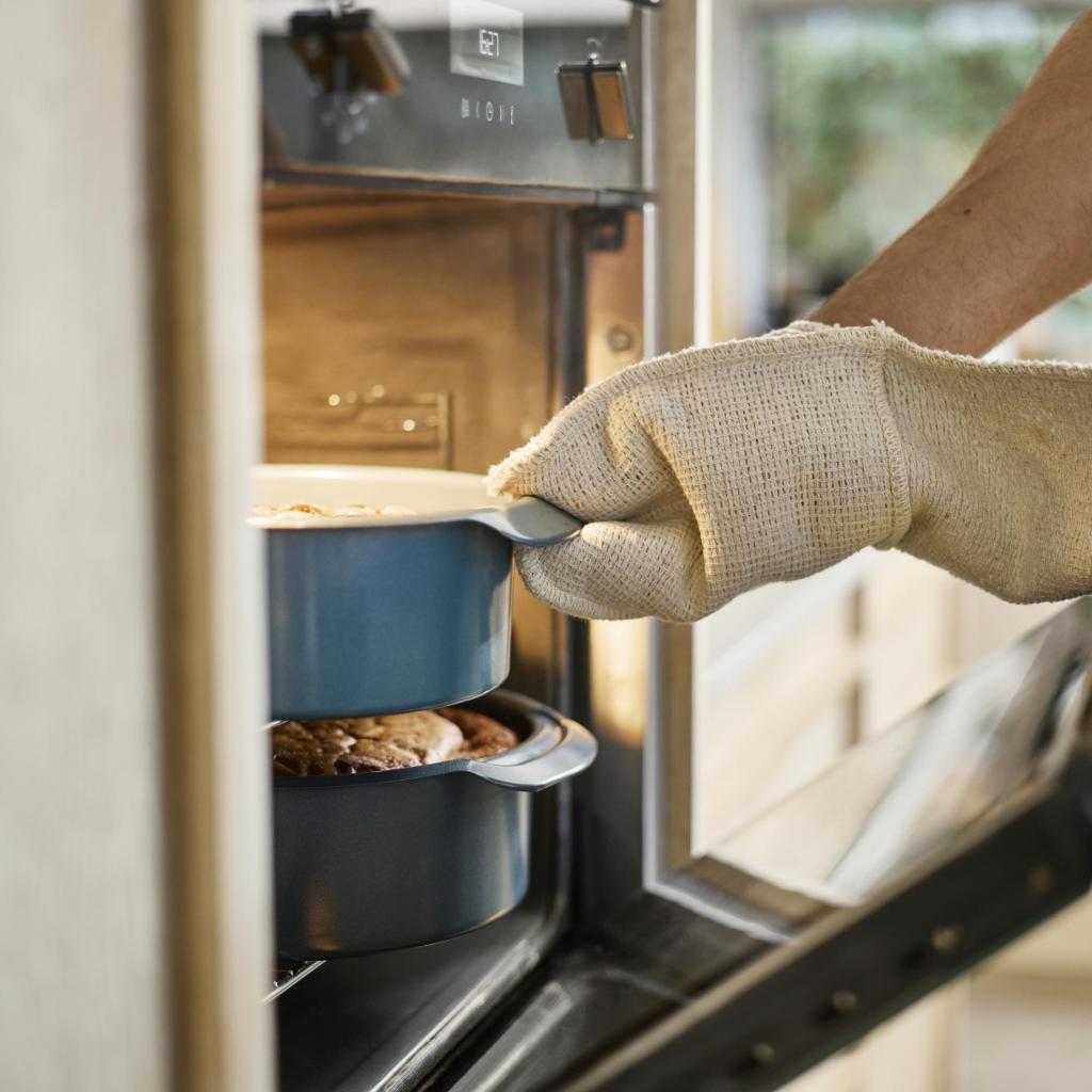 - De udvidede sidegreb giver et større grebsområde, hvilket gør det lettere at håndtere formen, når du bruger grydelapper.