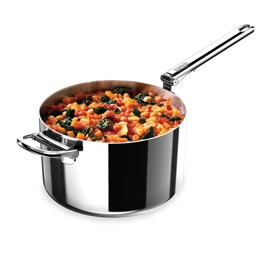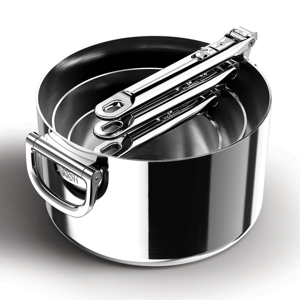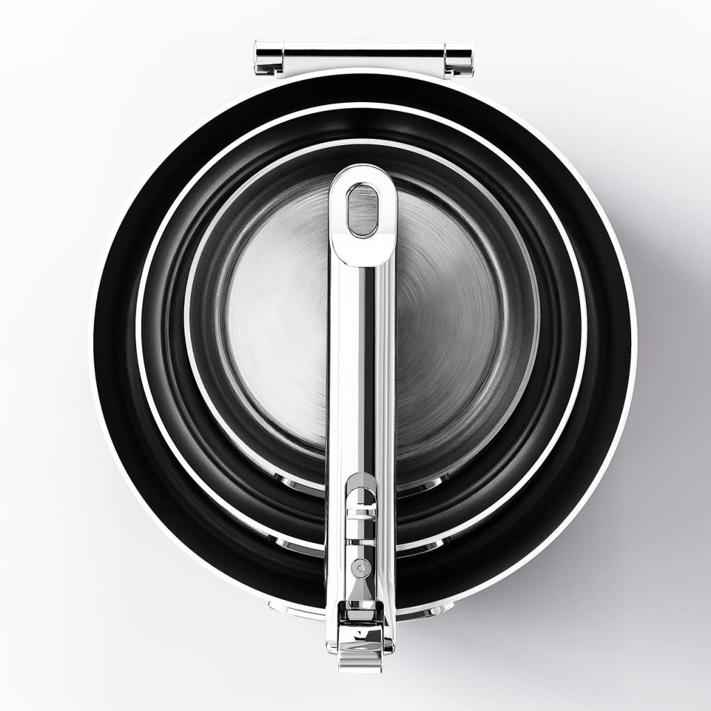 - Takket være de foldbare håndtag kan gryderne nemt stables oven på hinanden, hvilket sparer op til 50 % mere opbevaringsplads sammenlignet med almindeligt køkkengrej.