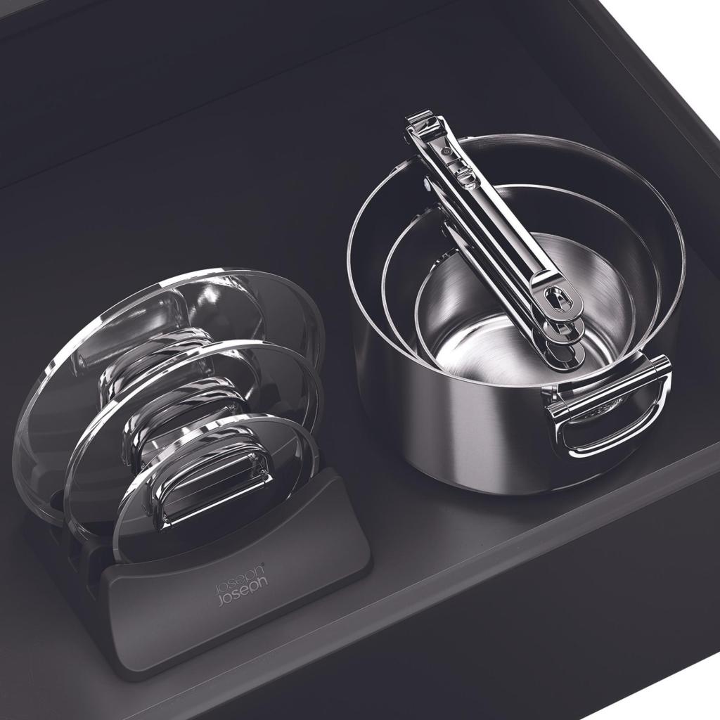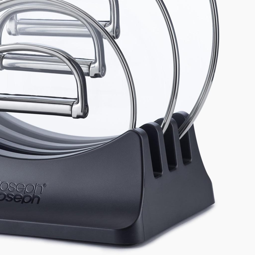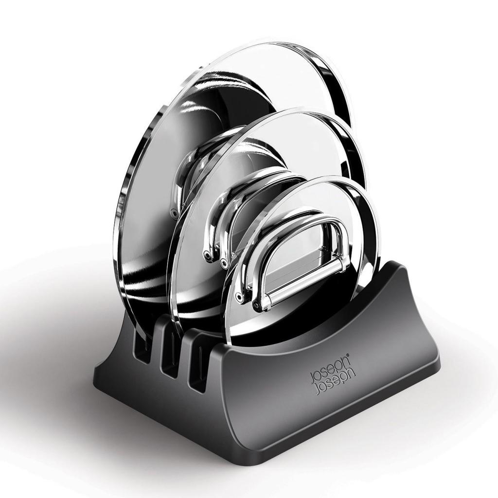 - Det praktiske glaslåg-stativ kan rumme op til tre glaslåg og hjælper med at holde orden i køkkenskabet.