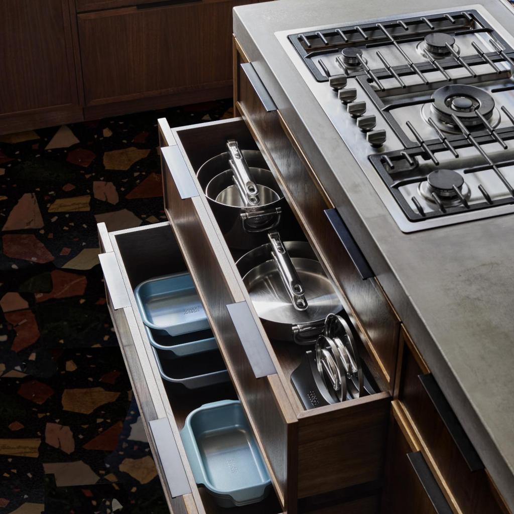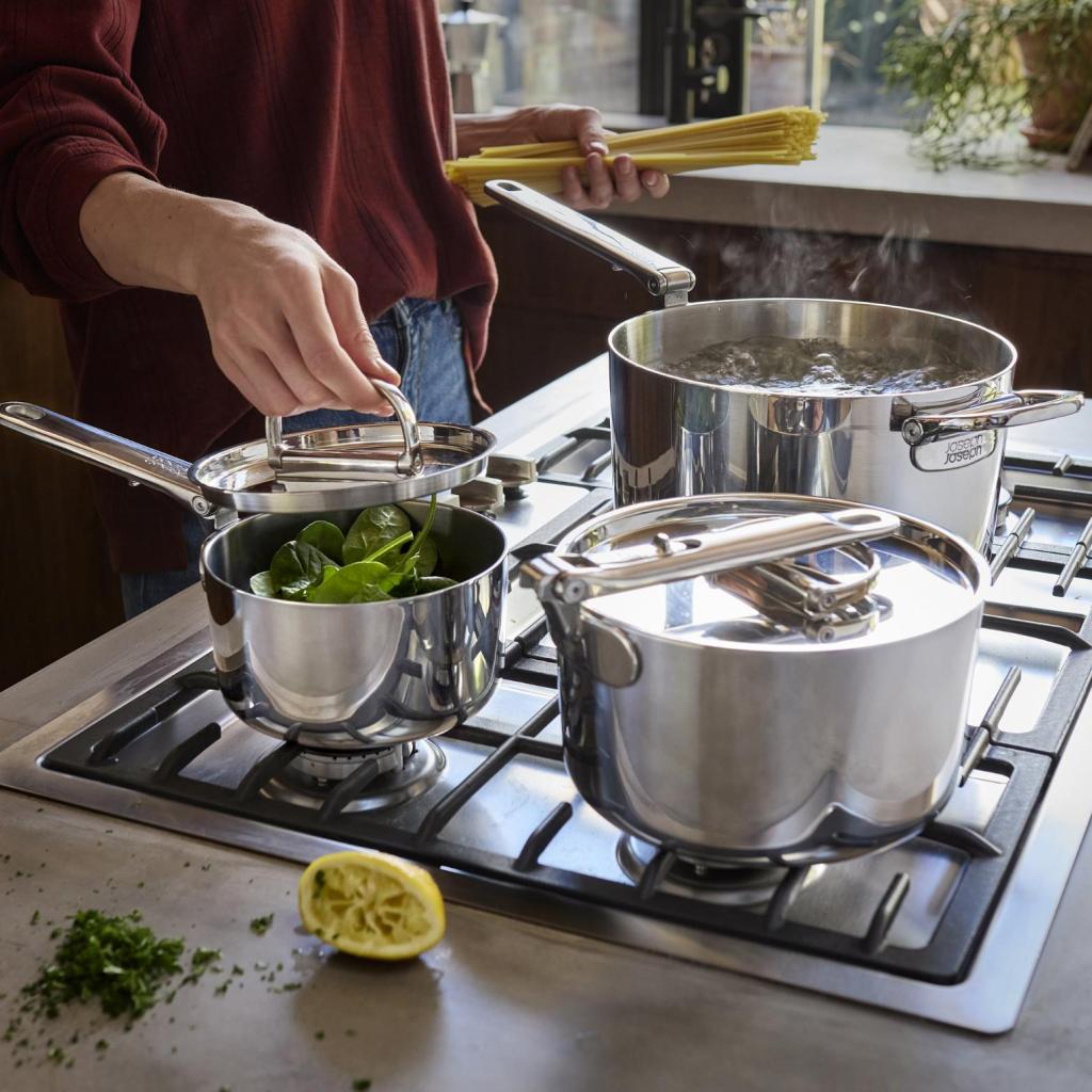 - Joseph Joseph SPACE-sættet af premium køkkengrej transformerer køkkenorganisering med et gennemtænkt stabelbart system og professionel trelags konstruktion.