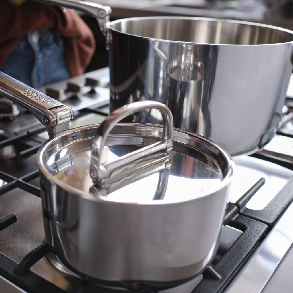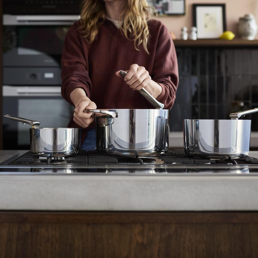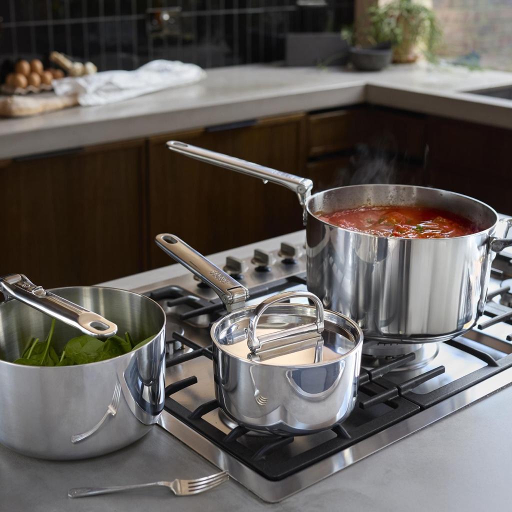 - Robust trelags konstruktion kombinerer en poleret ydre overflade af rustfrit stål, en aluminiumkerne for jævn varmefordeling og et indre lag af rustfrit stål.