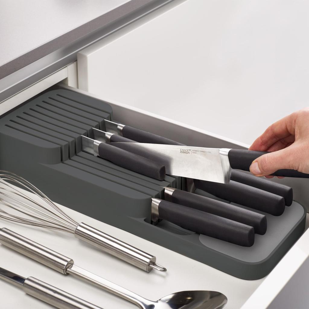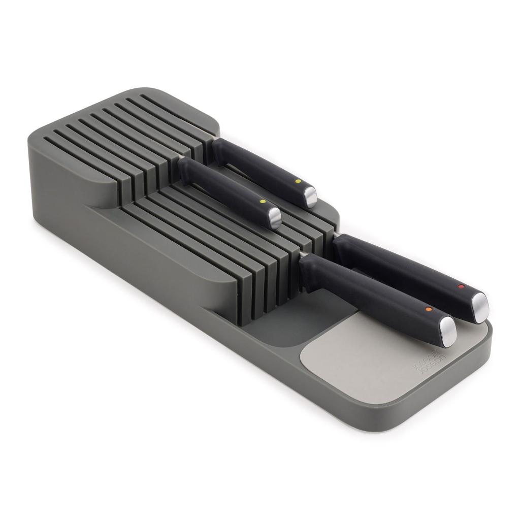 - Joseph Joseph DUO knivblok til skuffe er en praktisk løsning til sikker og overskuelig opbevaring af køkkenknive direkte i skuffen uden unødvendigt at optage plads på bordpladen.