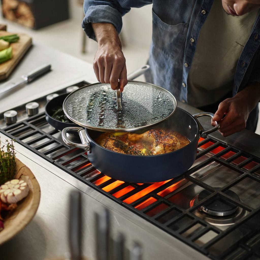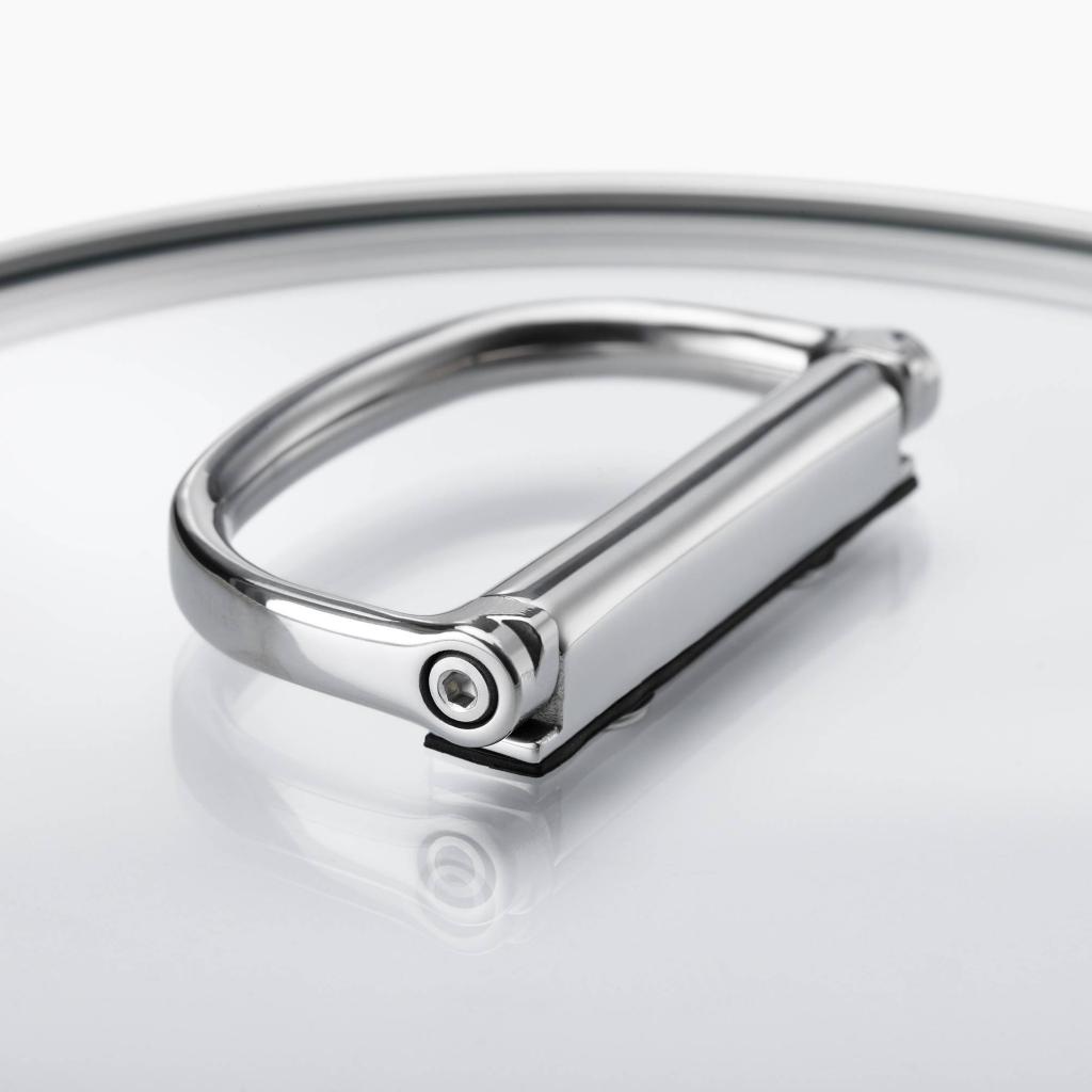 - Inkluderer et hærdet glas glaslåg med en rustfri stålkant og et sammenklappeligt håndtag for nem kompakt opbevaring