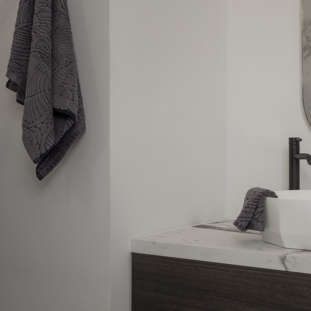 - mørkegrå lille håndklæde / for gæster er den en del af Extinct Animals-kollektionen, inspireret af uddøde dyr - i dette tilfælde Dodo-fuglens bløde fjer
