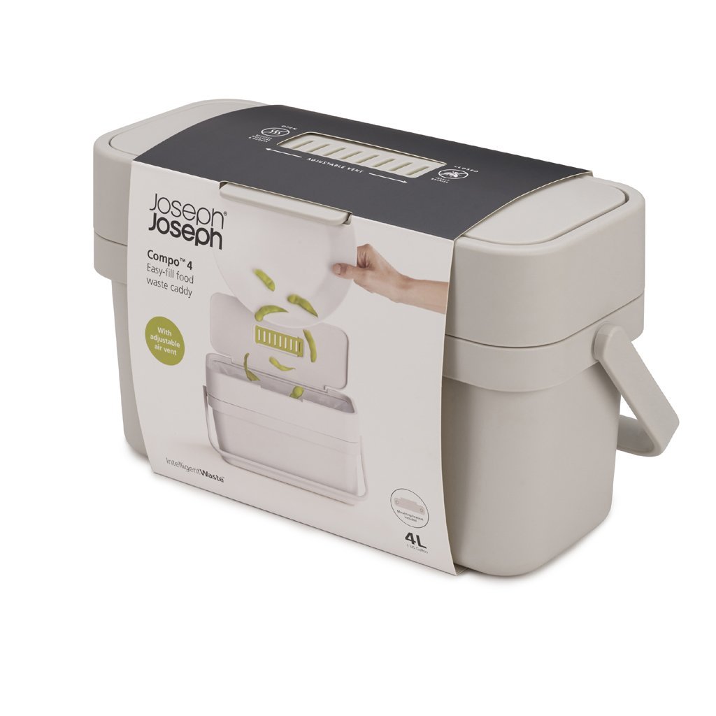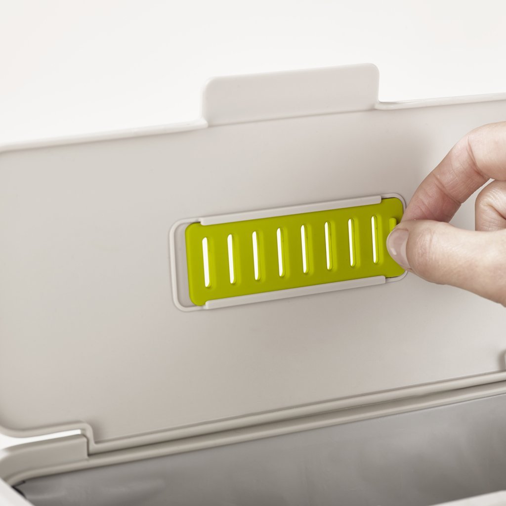 JOSEPH JOSEPH Compo-beholderen er designet som en praktisk kurv til rester. Takket være den smalle form optager den ikke plads på bordpladen. Den leveres med beslag til montering på indersiden af døren. Beholderens låg kan åbnes på vid gab, så resterne nemt kan skovles fra tallerknerne direkte ned i beholderen. Låget har låsbare ventilationshuller. I åben position lader de fugten slippe ud og reducerer dermed eventuelle lugtgener. Om sommeren forhindrer udluftningshætten insekter i at komme ind i beholderen. Beholderens kapacitet er 4 liter. I tilfælde af kompostering anbefales det at bruge bionedbrydelige poser.