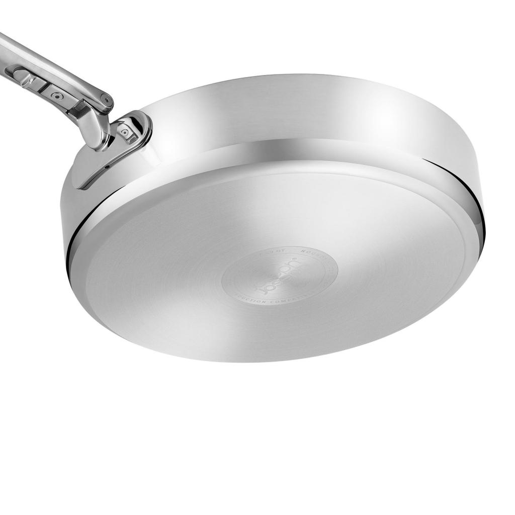 - Den robuste, tre-lags konstruktion af rustfrit stål med en aluminiumkerne fremmer hurtig opvarmning og jævn varmefordeling over hele bunden.