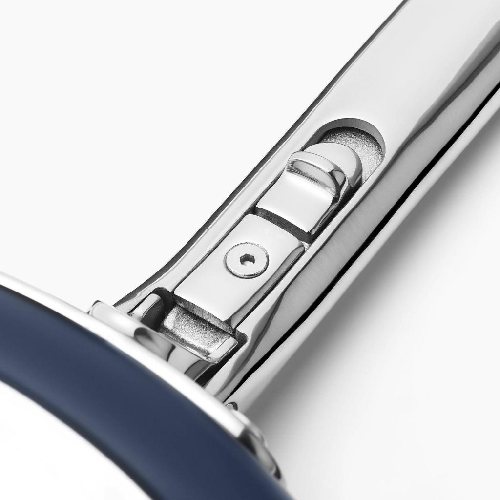 - Takket være den patenterede SwingLock™ teknologi har den et foldbart håndtag i rustfrit stål, der muliggør kompakt stabling i skuffer og skabe.