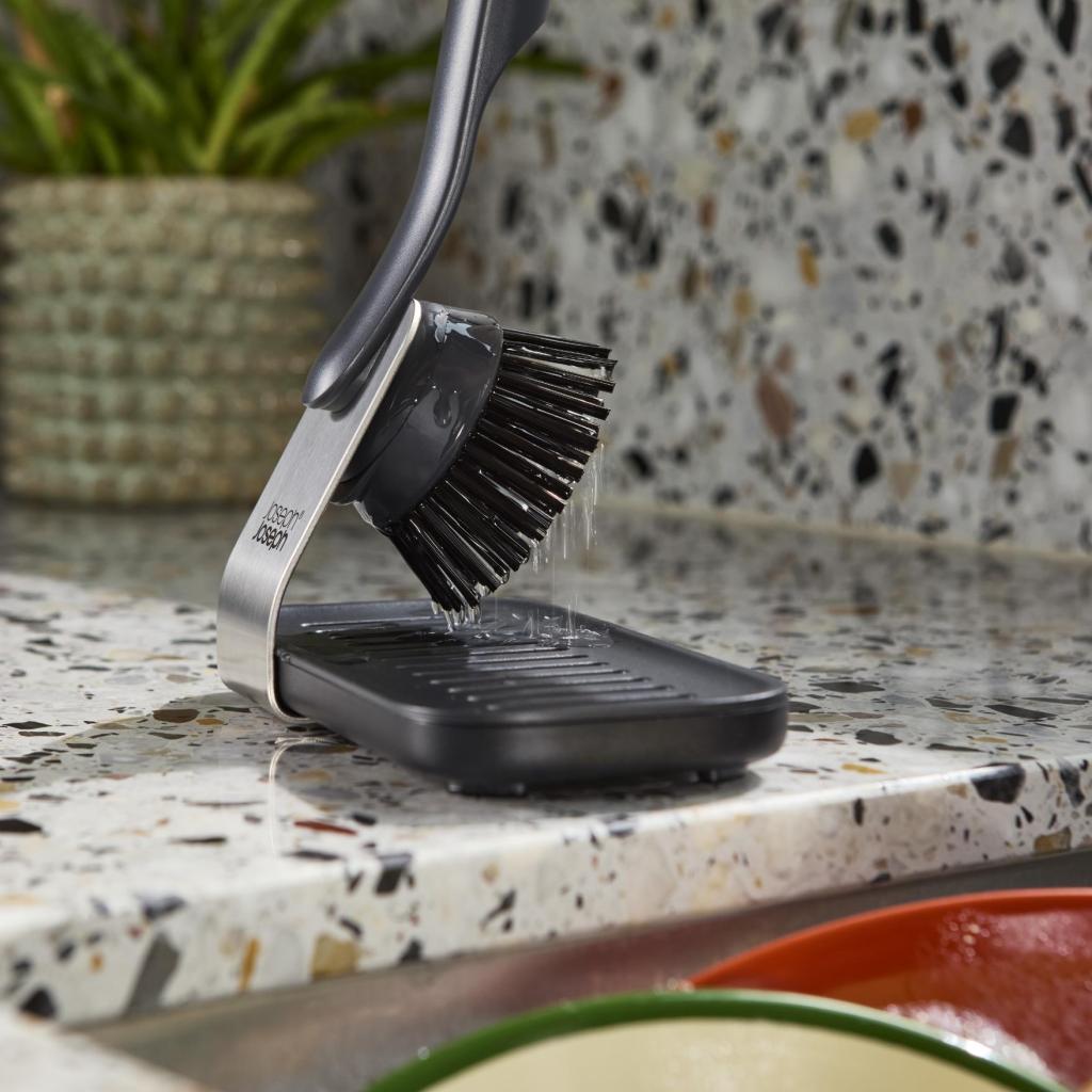 En indtørret lasagnebradepande tror, den vinder. Børstens faste børstehår går i gang uden tøven, og svampen finpudser detaljerne. Og når det er gjort, sættes alt tilbage i holderen, hvor det ikke kun ser godt ud, men også tørrer hurtigt. Hvad mere kan man ønske sig?