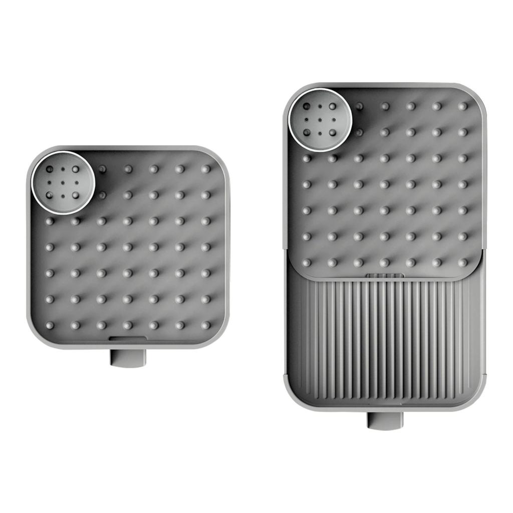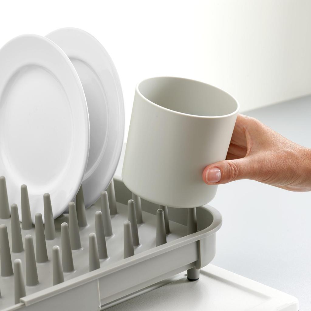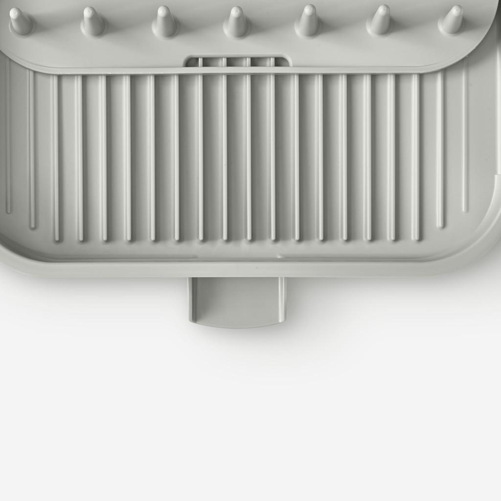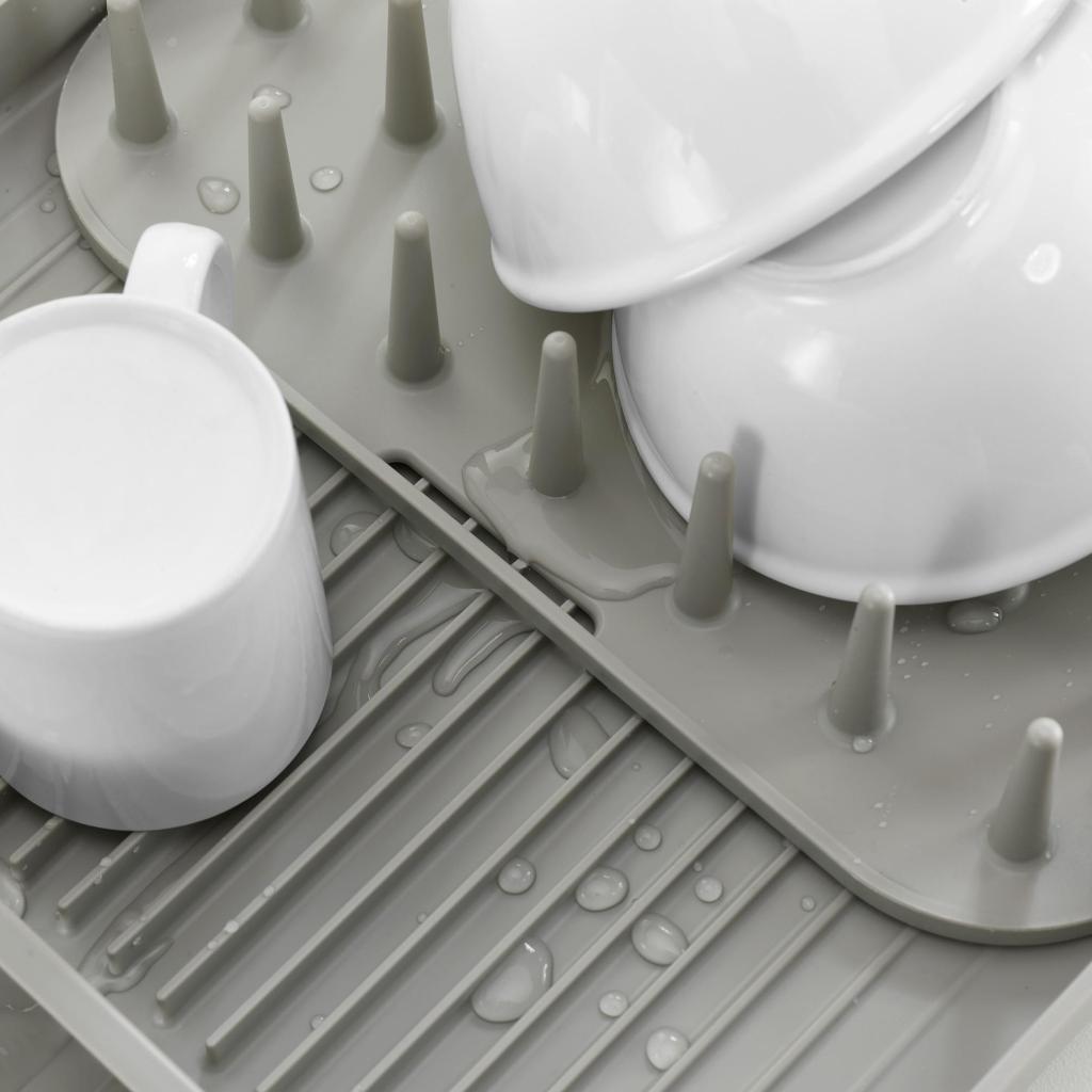 - Den profilerede overflade med pigge holder tallerkener sikkert i oprejst position og muliggør hurtig og effektiv aftørring efter håndvask.