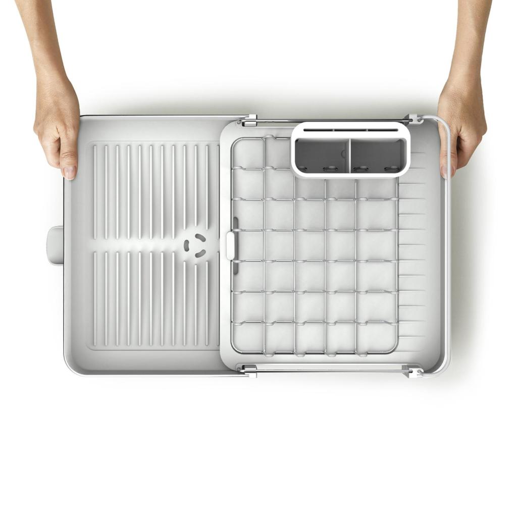 - Det udfoldelige design gør det muligt at øge afdrypningsområdet til det dobbelte af størrelsen, så det kan rumme flere tallerkener, glas eller skåle efter større opvask.