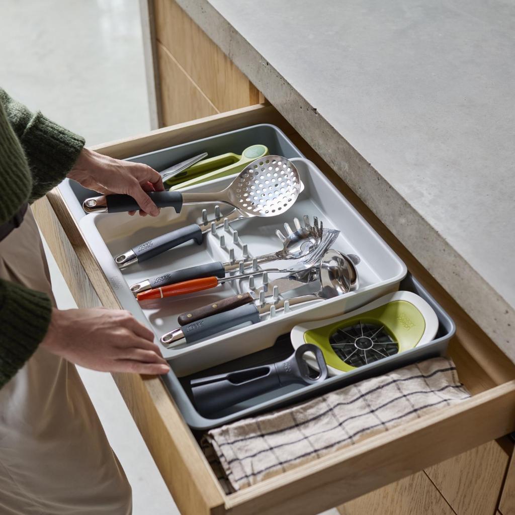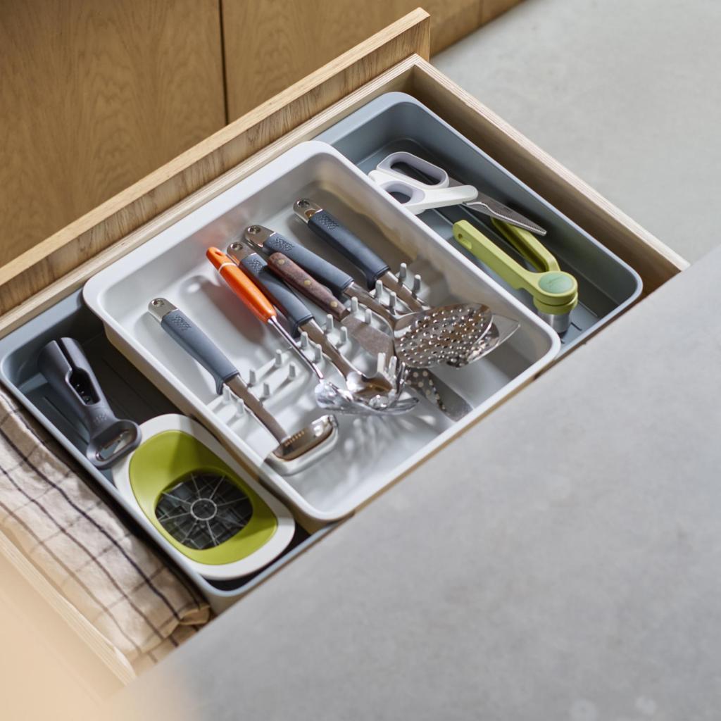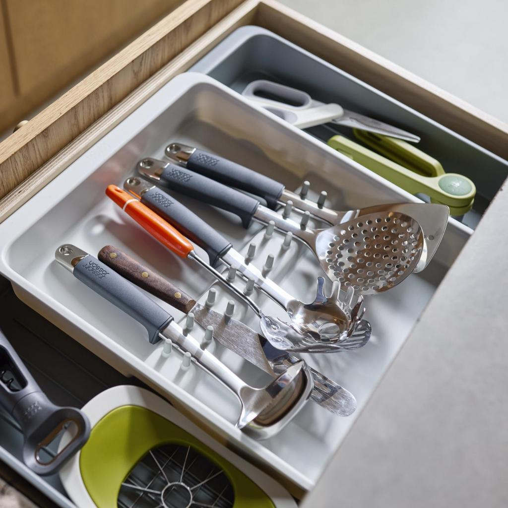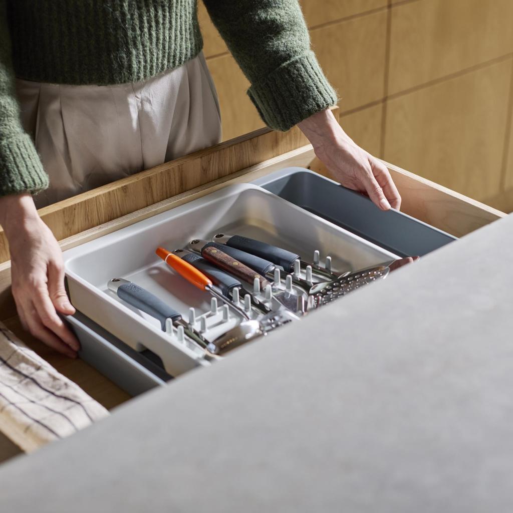 - Joseph Joseph DRAWERSTORE skuffeorganizer hjælper med at organisere køkkenredskaber og tilbehør pænt i skuffen.
