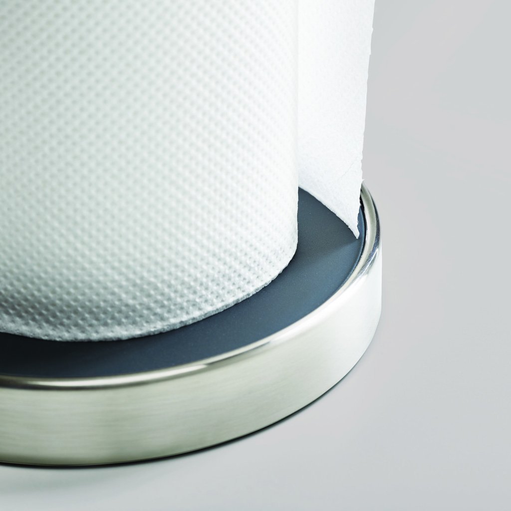 JOSEPH JOSEPH Push&Tear Paper Towel Roll Stand har et fjederbelastet hoved, som du trykker på for at låse rullen på plads, når du river den af. Hvis du har beskidte hænder, giver hovedet i rustfrit stål dig også mulighed for at klemme med dit håndled eller din underarm. Den hævede kant på stativets bund forhindrer papiret i at rulle sig ud af sig selv. Undersiden af stativet har en skridsikker overflade. Nye ruller indsættes, når hovedet er fjernet. Stativet er egnet til papirruller, der er op til 24 cm høje.