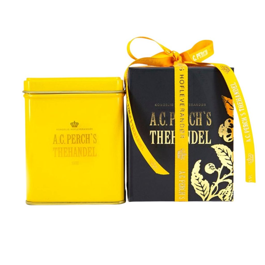 - gul -båndet med AC Perchs Thehandel-logo giver hele pakken et luksuriøst udseende og understreger mærkets premiumkarakter