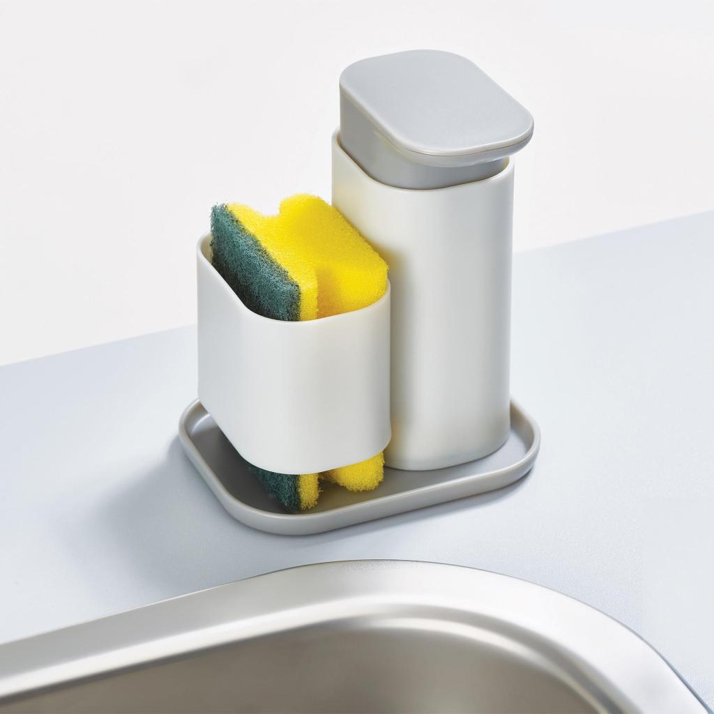 - Sæbedispenser eller opvaskemiddel med svampeholder DUO 851679 er en praktisk og kompakt løsning til at holde orden omkring køkkenvasken eller håndvasken.