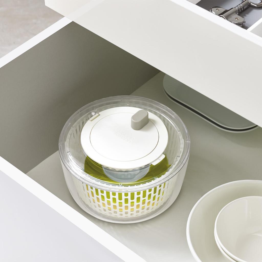 - Grundlaget er en roterende centrifug, der efter skylning skånsomt og effektivt tørrer salatbladene, så de forbliver sprøde og klar til øjeblikkelig servering.
