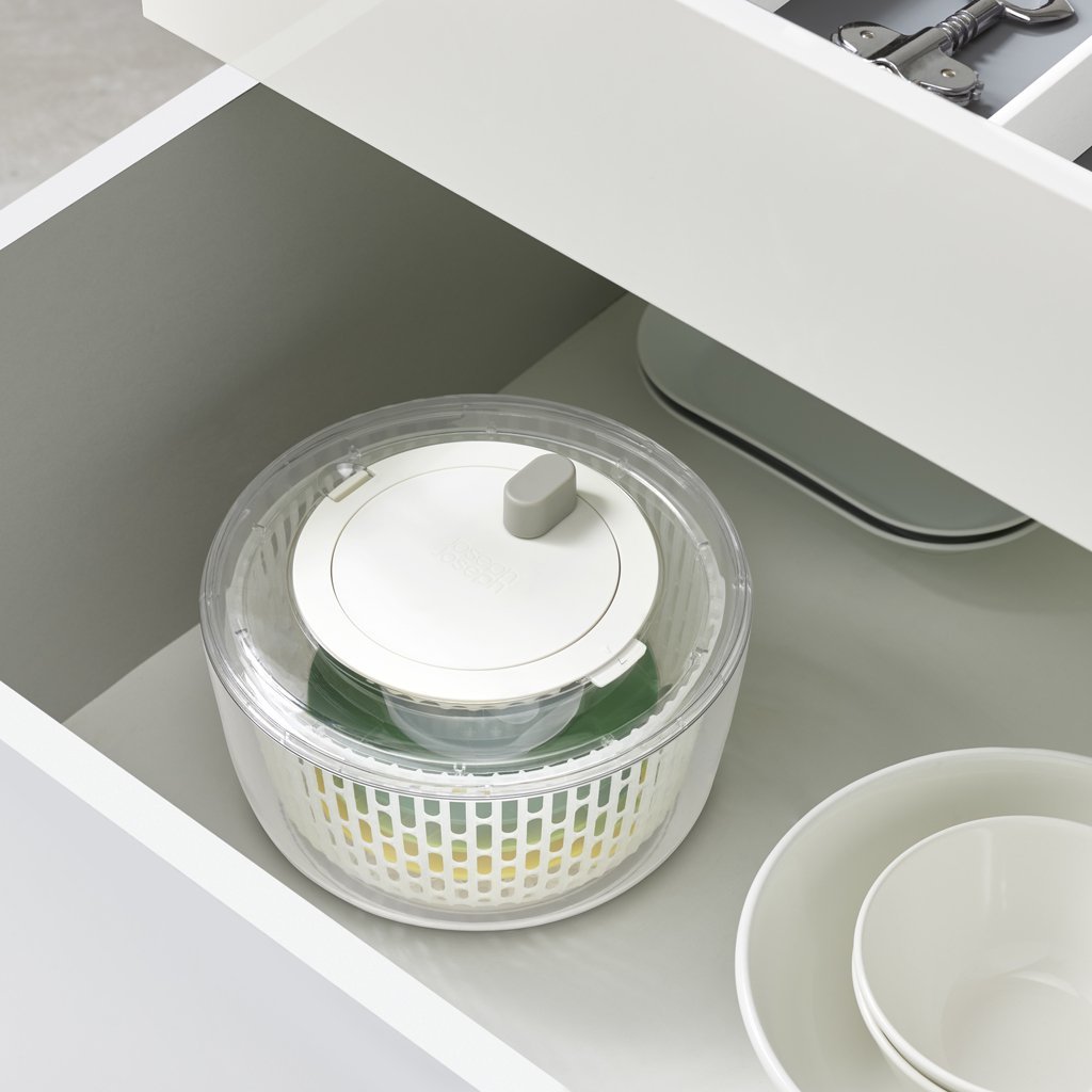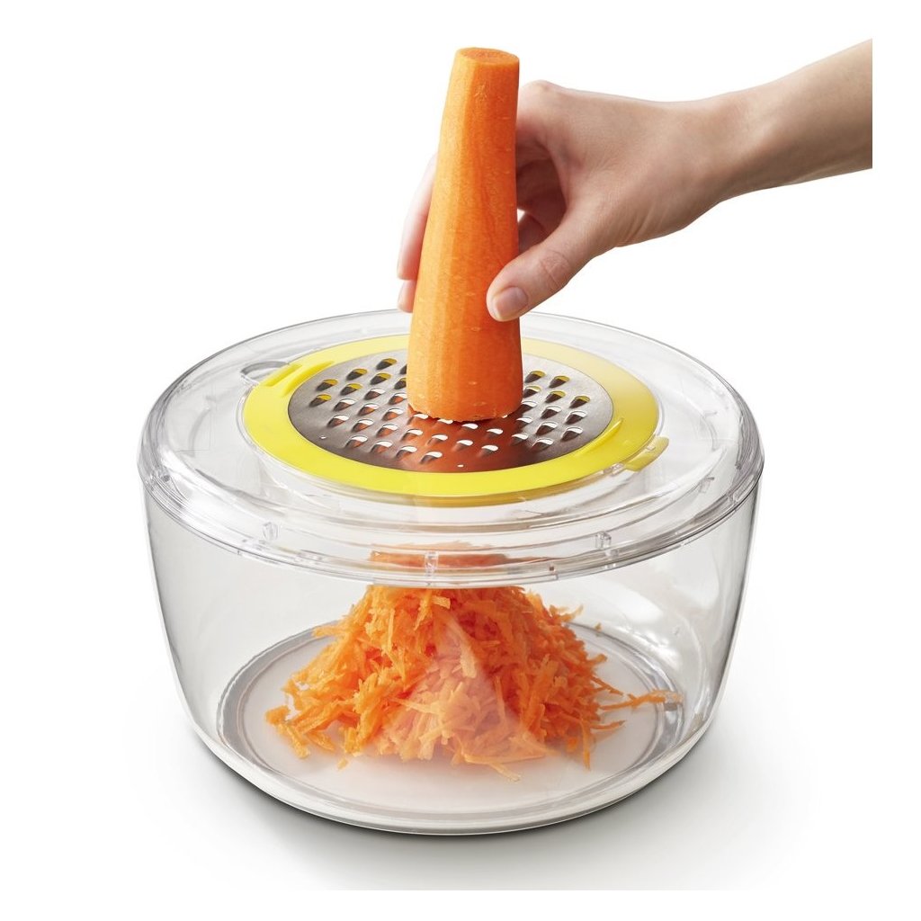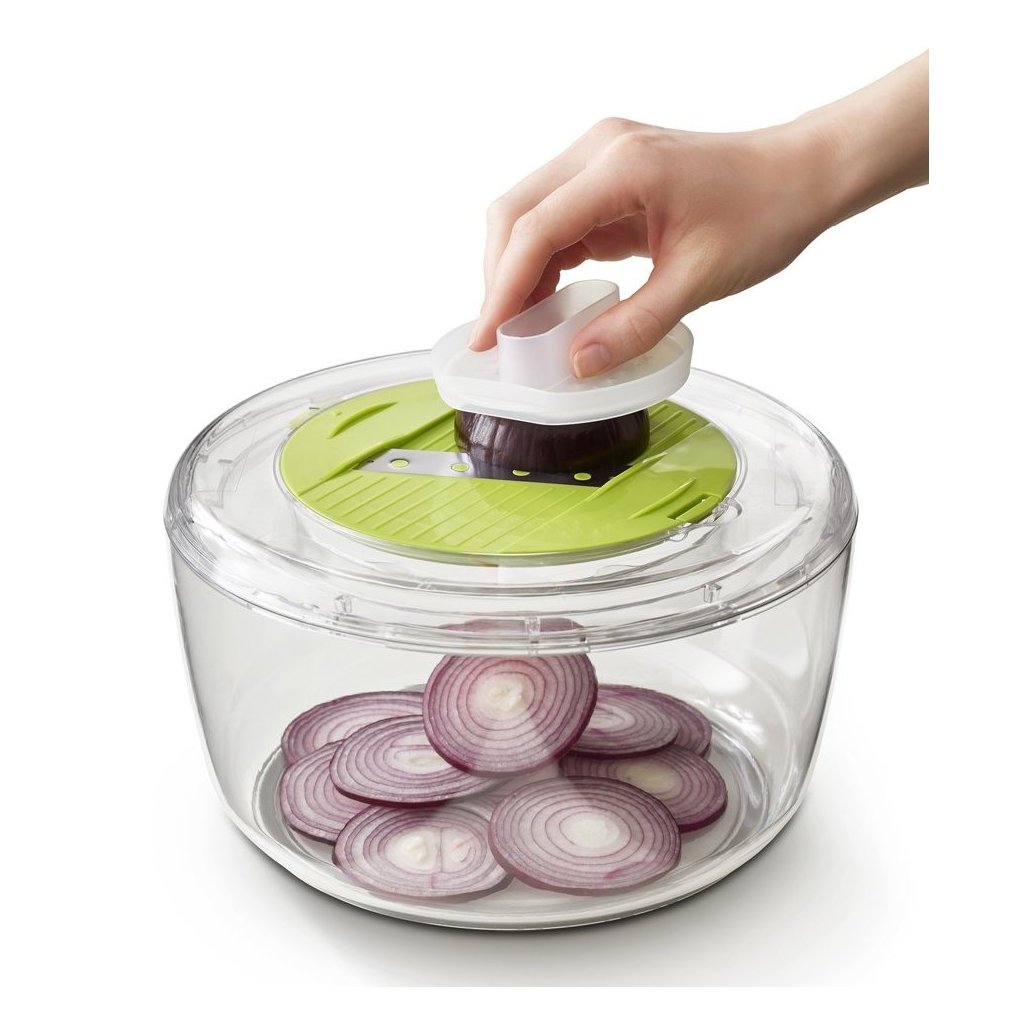 Universalsæt til hurtig og nem tilberedning af salat JOSEPH JOSEPH Multi-Prep. Grundlaget for sættet er den roterende salatcentrifuge. Når du har tørret den vaskede salat, kan du fjerne midterskiven i låget på beholderen og erstatte den med en skive til spiralskæring, snitning eller rivning af grøntsager efter behov. Der er fingerbeskyttelse til sikkert arbejde. Skålen har en skridsikker bund, der sikrer, at den står stabilt på bordpladen.