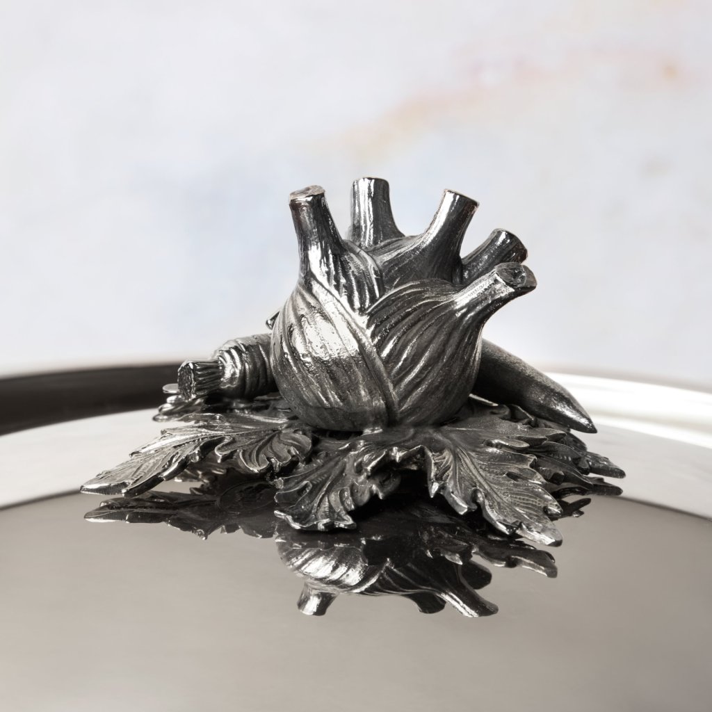 - solidt låg i rustfrit stål med et håndtag i en smuk dekoration, som er håndstøbt i massiv bronze og forsølvet