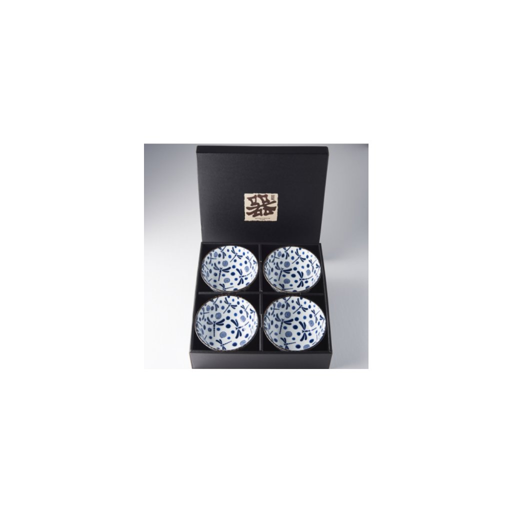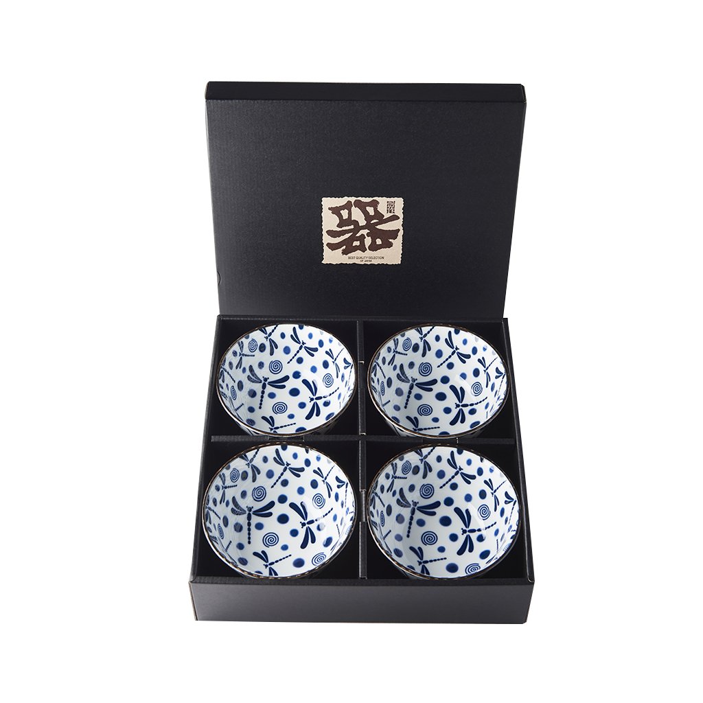 Sættet indeholder 4 skåle med blå guldsmede på hvid baggrund. Skålens kant er omkranset af sølvfarve. Dette sæt leveres i en elegant sort gaveæske og er derfor velegnet som gave til venner eller forretningspartnere.