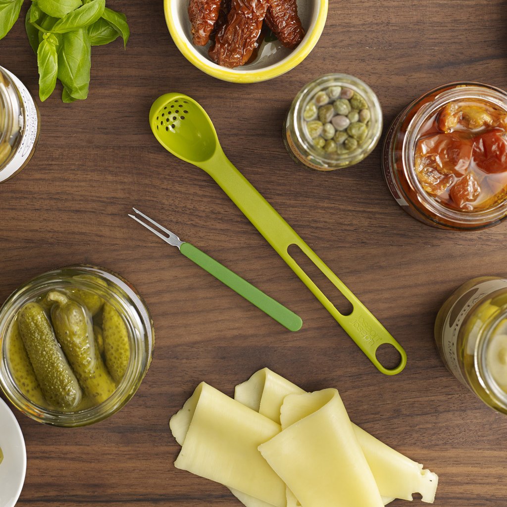 Løg, agurker og oliven bør ikke mangle til nogen sammenkomst, fest eller grillaften. Det "professionelle" værktøj fra designstudiet Morph hjælper dig med at få dem elegant ud af glasset. Den perforerede ske med lukket form fanger pålideligt glatte løg eller oliven, og du kan ske dem direkte på tallerkenen uden saltlage. Brug minigaflen (spyddet) til sprøde pickles og skiveskåret pølse. Så kan festen med stil begynde.