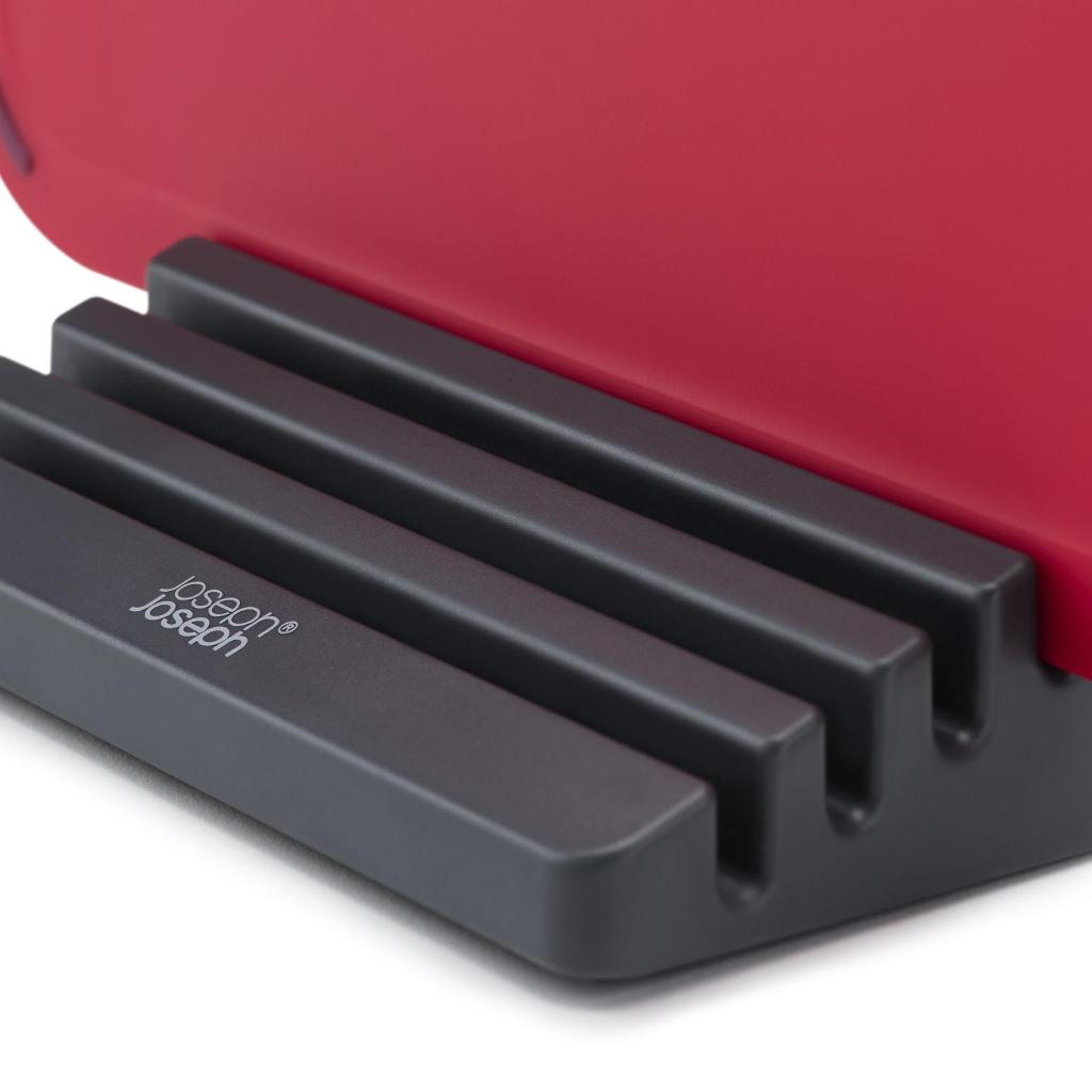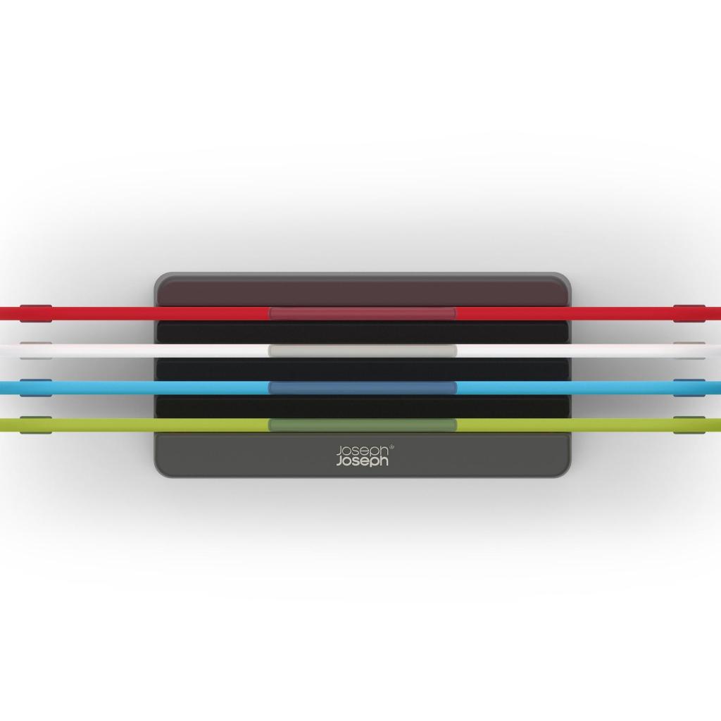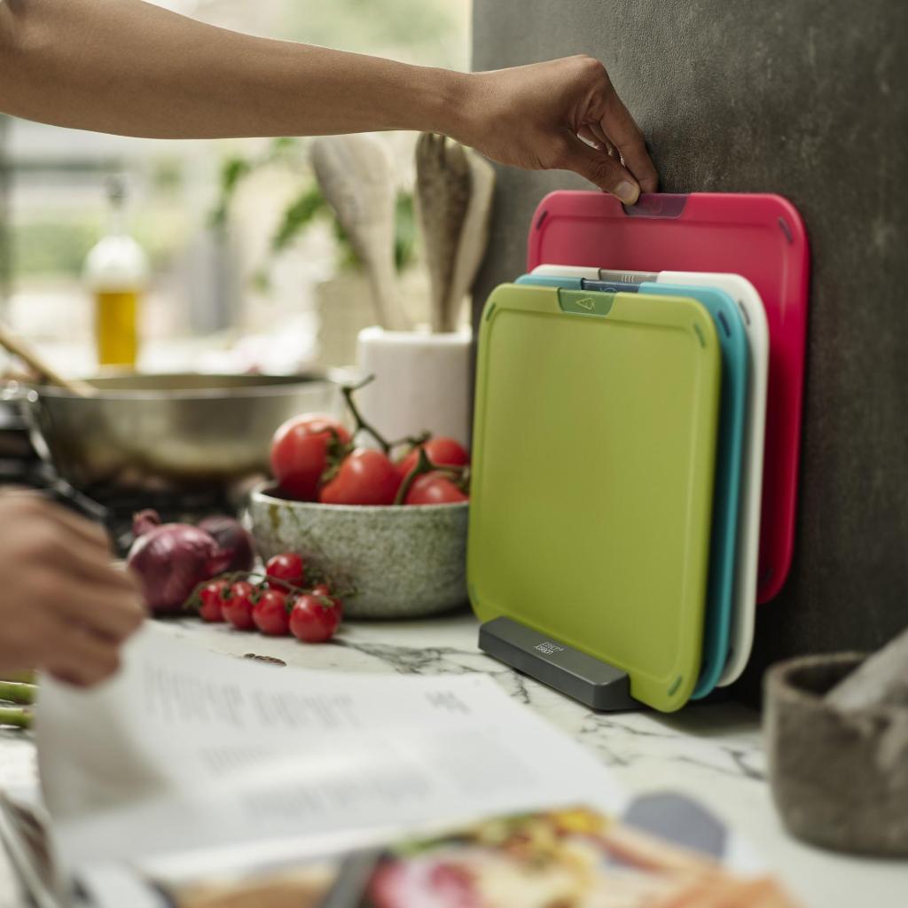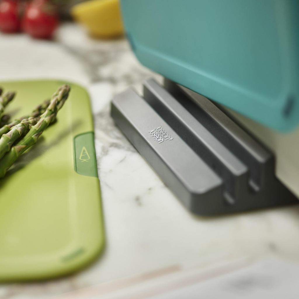 - Sættet med skærebrætter og stativ fra Joseph Joseph DUO ICON tilbyder en praktisk løsning til hygiejnisk adskilt skæring af forskellige fødevaretyper i det daglige hjemmekøkken.