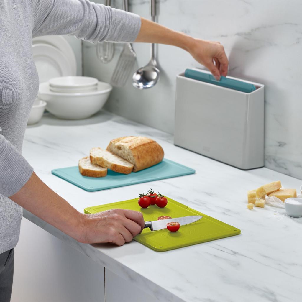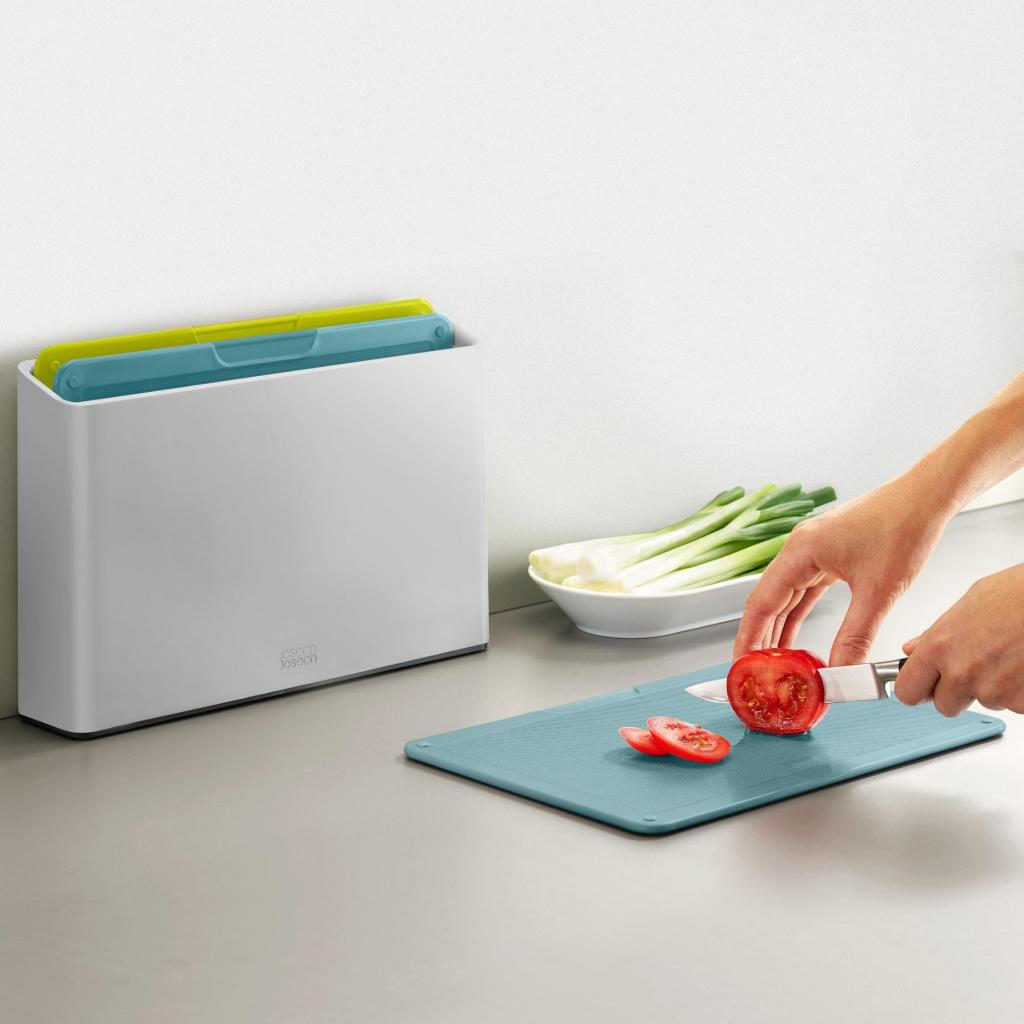 - Joseph Joseph DUO OPAL skærebrætsættet med stativ er en praktisk løsning til hygiejnisk adskilt tilberedning af råvarer i et dagligt hjemmekøkken.