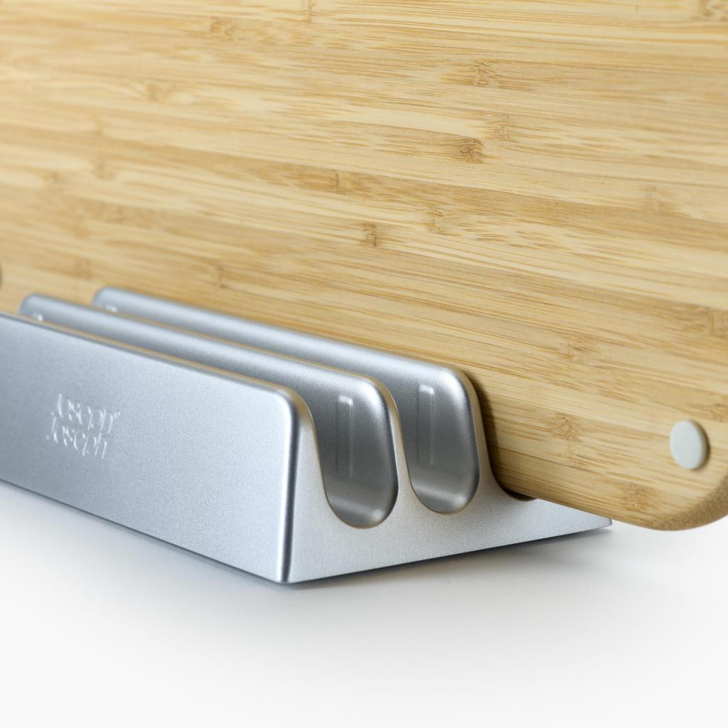 - Joseph Joseph NEST skærebrættesættet indeholder 3 bambusskærebrætter opbevaret i et kompakt metalstativ, der holder bordpladen overskueligt organiseret under madlavningen.