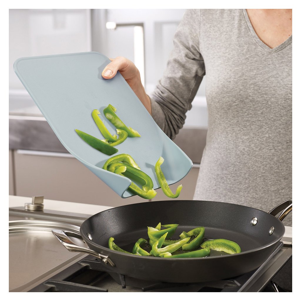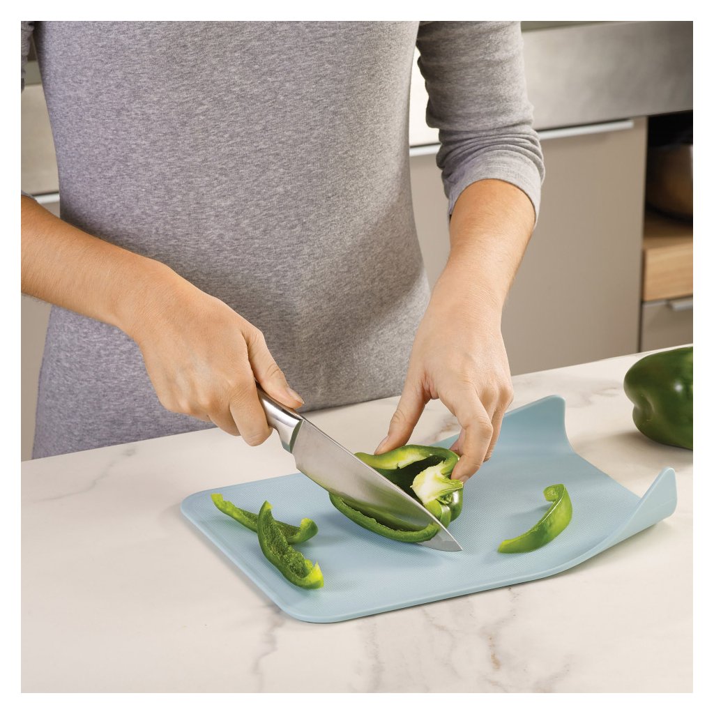 At skære på skærebrættet er en del af enhver madlavningsproces. Det er forberedelsesarbejdet, der er startlinjen for en gastronomisk ekspedition i køkkenet. Takket være den særlige kurve kan pladerne stables perfekt og også placeres på kanten af bordpladen. På den måde undgår man det svineri, der ofte opstår, når man skødesløst overfører det til redskaberne.