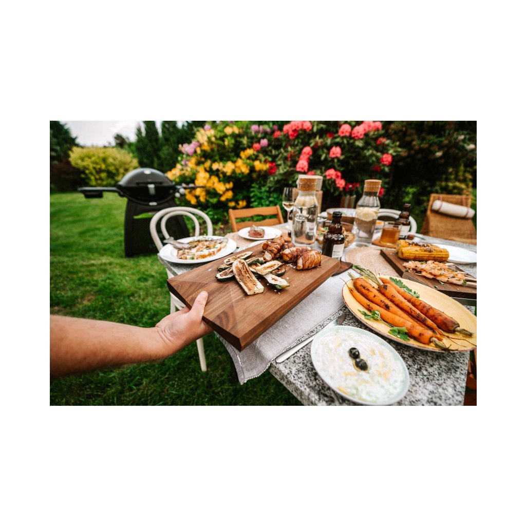 - udskæringerne (en på hver side) fungerer som en tragt, der gør det nemt at øse de hakkede grøntsager op i skålen og også gør det nemmere at løfte skærebrættet fra bordpladen