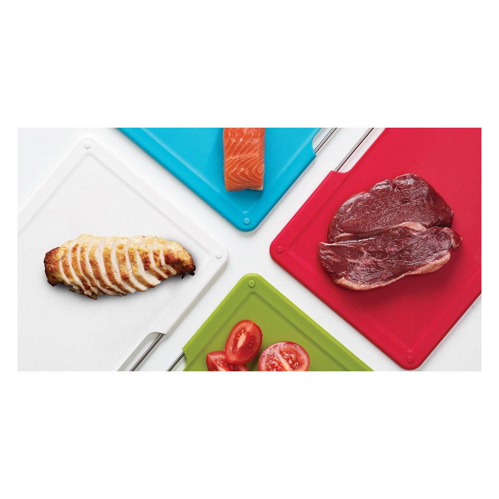 Dette Folio-skærebrætssæt er den perfekte løsning til ethvert køkken. I plaststativet finder du 4 skærebrætter - til råt kød, fisk, grøntsager og tilberedt mad. Hver plade har en anden farve, så du nemt kan skelne dem fra hinanden. Håndtagene i rustfrit stål gør det nemt at fjerne skærebrætterne, og det separate mellemrum mellem skærebrætterne sikrer, at de tørrer hurtigt. Skærebrætterne er specielt designet til at bevare dine knives tilstand og til at gøre det så sikkert og hygiejnisk som muligt at skære mad. De tåler opvaskemaskine.